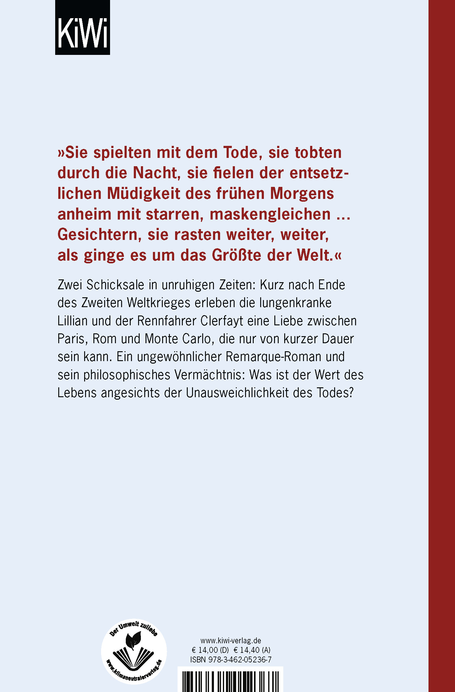 | Schlagworte | Erich Maria Remarque • Europa-Reise • Im Westen nichts Neues • Krankheit • Liebesgeschichte • Paris • Rennfahrer • Rom • Sanatorium • Sizilien |