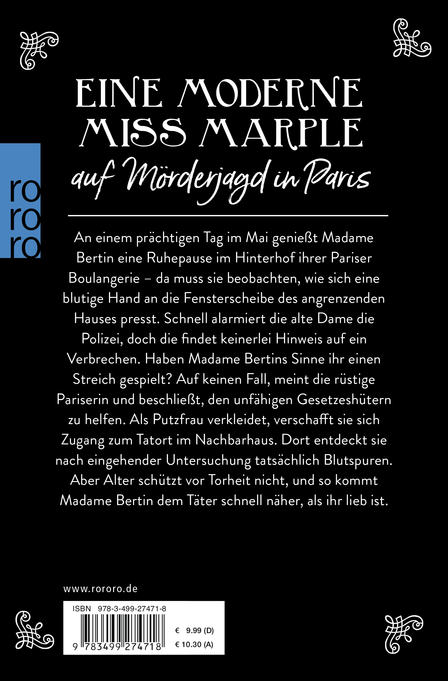 An einem prächtigen Tag im Mai genießt Madame Bertin eine Ruhepause im Hinterhof ihrer Pariser Boulangerie - da muss sie beobachten, wie sich eine blutige Hand an die Fensterscheibe des angrenzenden Hauses presst. Schnell alarmiert die alte Dame die Polizei, doch die findet keinerlei Hinweis auf ein Verbrechen. Haben Madame Bertins Sinne ihr einen Streich gespielt? Auf keinen Fall, meint die rüstige Pariserin und beschließt, den unfähigen Gesetzeshütern zu helfen. Als Putzfrau verkleidet, verschafft sie sich Zugang zum Tatort im Nachbarhaus. Dort entdeckt sie nach eingehender Untersuchung tatsächlich Blutspuren. Aber Alter schützt vor Torheit nicht, und so kommt Madame Bertin dem Täter schnell näher, als ihr lieb ist.