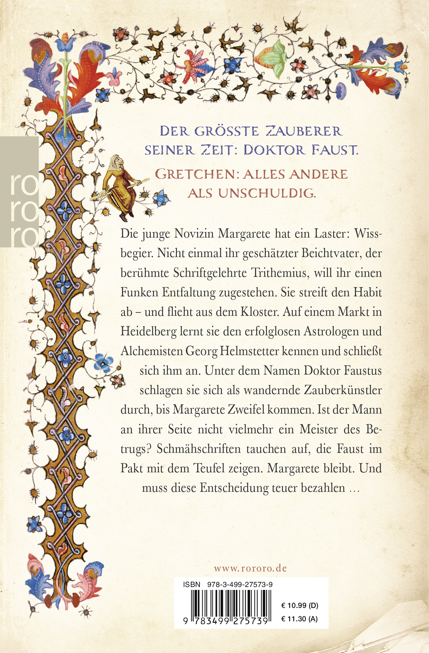 Die junge Novizin Margarete hat ein Laster: Wissbegier. Nicht einmal ihr geschätzter Beichtvater, der berühmte Schriftgelehrte Trithemius, will ihr einen Funken Entfaltung zugestehen. Sie streift den Habit ab - und flieht aus dem Kloster. Auf einem Markt in Heidelberg lernt sie den erfolglosen Astrologen und Alchimisten Georg Helmstetter kennen und schließt sich ihm an. Unter dem Namen Doktor Faustus schlagen sie sich als wandernde Zauberkünstler durch, bis Margarete Zweifel kommen. Ist der Mann an ihrer Seite nicht vielmehr ein Meister des Betrugs? Schmähschriften tauchen auf, die Faust im Pakt mit dem Teufel zeigen. Margarete bleibt. Und muss diese Entscheidung teuer bezahlen ...