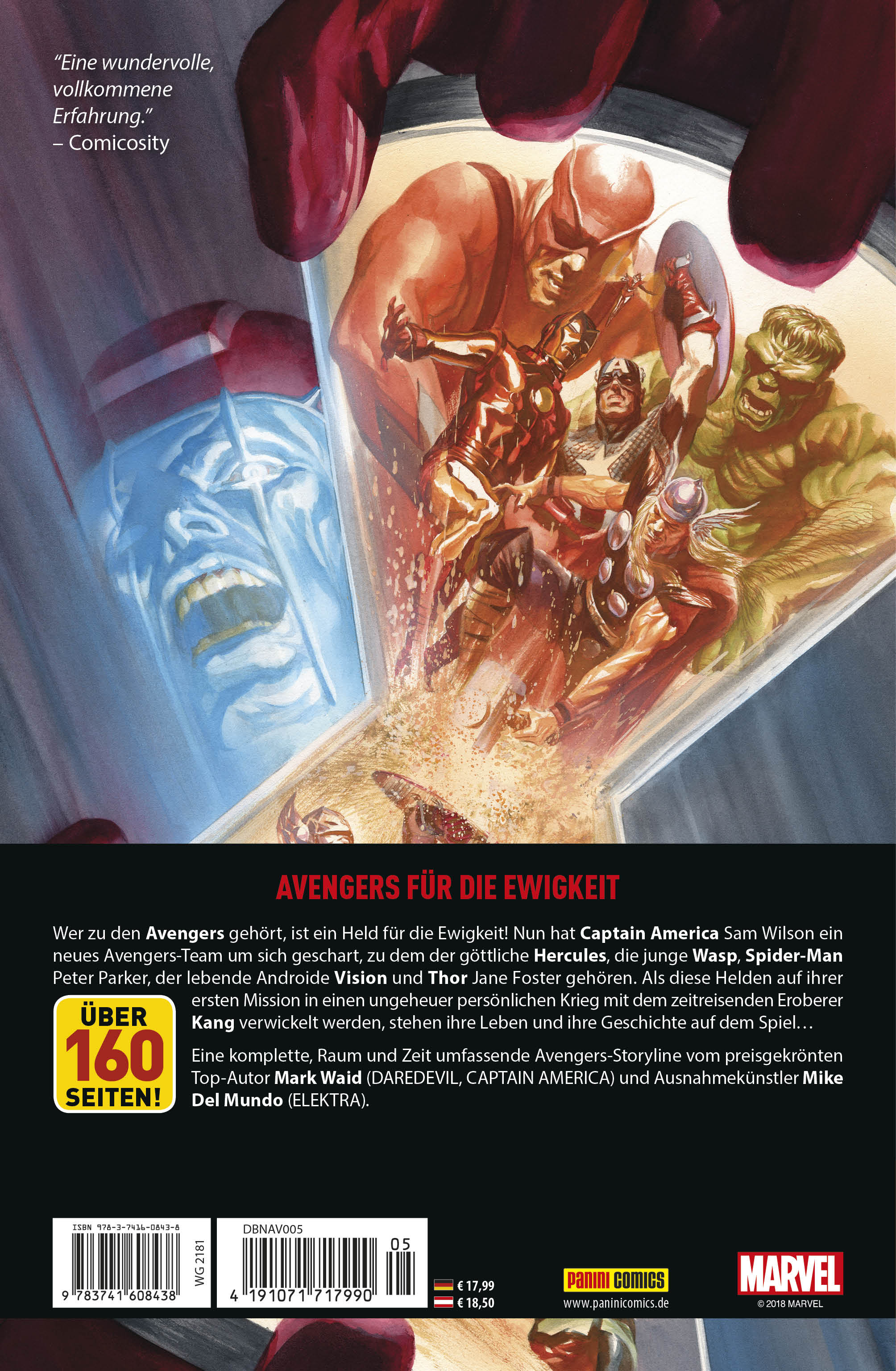AVENGERS, SAMMELN… von Christian Endres Vor vielen Jahren kamen Ant-Man, Wasp, Iron Man, Thor und Hulk als die allerersten Avengers zusammen. Seither hat das Team der mächtigsten Helden des Marvel-Universums allerhand Inkarnationen gesehen – und zahlreiche Helden, die als Teil eines Avengers-Teams für das Gute kämpften. Allen voran Steve Rogers, aber auch Captain Marvel Monica Rambeau, She-Hulk Jennifer Walters, Black Knight Dane Whitman oder Namor aus Atlantis. In diesem Band schart Sam Wilson, der ehemalige Falcon und gegenwärtige Captain America, nun ein neues Avengers-Team um sich, nachdem der zweite Superhelden-Bürgerkrieg in CIVIL WAR II die Heldengemeinschaft erschüttert hat und die Nachwuchshelden um Ms. Marvel Sams vorherige Avengers-Truppe verlassen haben. Zum Team gehören der synthetische Mensch bzw. lebendige Androide Vision, Thor Jane Foster, die neue Wasp, der göttliche Hercules und Spider-Man Peter Parker, dem die Ressourcen des weltweiten Firmenimperiums Parker Industries zur Verfügung stehen. In der folgenden Geschichte von Autor Mark Waid und Zeichner Mike Del Mundo müssen diese Helden direkt die Konsequenzen von Visions Taten tragen. Er reiste kürzlich nämlich durch die Zeit, um Kang den Eroberer als Baby zu entführen und den Schurken so ein für alle Mal zu neutralisieren. Denn Kang gehört zu den gefährlichsten Bösewichten der Avengers-Geschichte, der schon so oft durch die Zeit sprang, dass es im Zeitstrom verschiedene Versionen von ihm gibt, darunter Scarlet Centurion und Immortus. Diese Versionen von Kang können böse, gut, neutral oder irgendetwas dazwischen sein – und sind immer ungeheuer mächtig…
