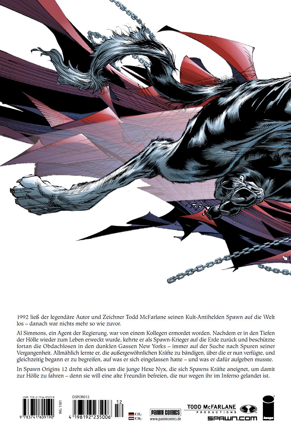 1992 ließ der legendäre Autor und Zeichner Todd McFarlane seinen Kult-Antihelden Spawn auf die Welt los - danach war nichts mehr so wie zuvor.Al Simmons, ein Agent der Regierung, war von einem Kollegen ermordet worden. Nachdem er in den Tiefen der Hölle wieder zum Leben erweckt wurde, kehrte er als Spawn-Krieger auf die Erde zurück und beschützte fortan die Obdachlosen in den dunklen Gassen New Yorks - immer auf der Suche nach Spuren seiner Vergangenheit. Allmählich lernte er, die außergewöhnlichen Kräfte zu bändigen, über die er nun verfügte, und gleichzeitig begann er zu begreifen, auf was er sich eingelassen hatte - und was er dafür aufgeben musste.In Spawn Origins 12 dreht sich alles um die junge Hexe Nyx, die sich Spawns Kräfte aneignet, um damit zur Hölle zu fahren - denn sie will eine alte Freundin befreien, die nur wegen ihr im Inferno gelandet ist.