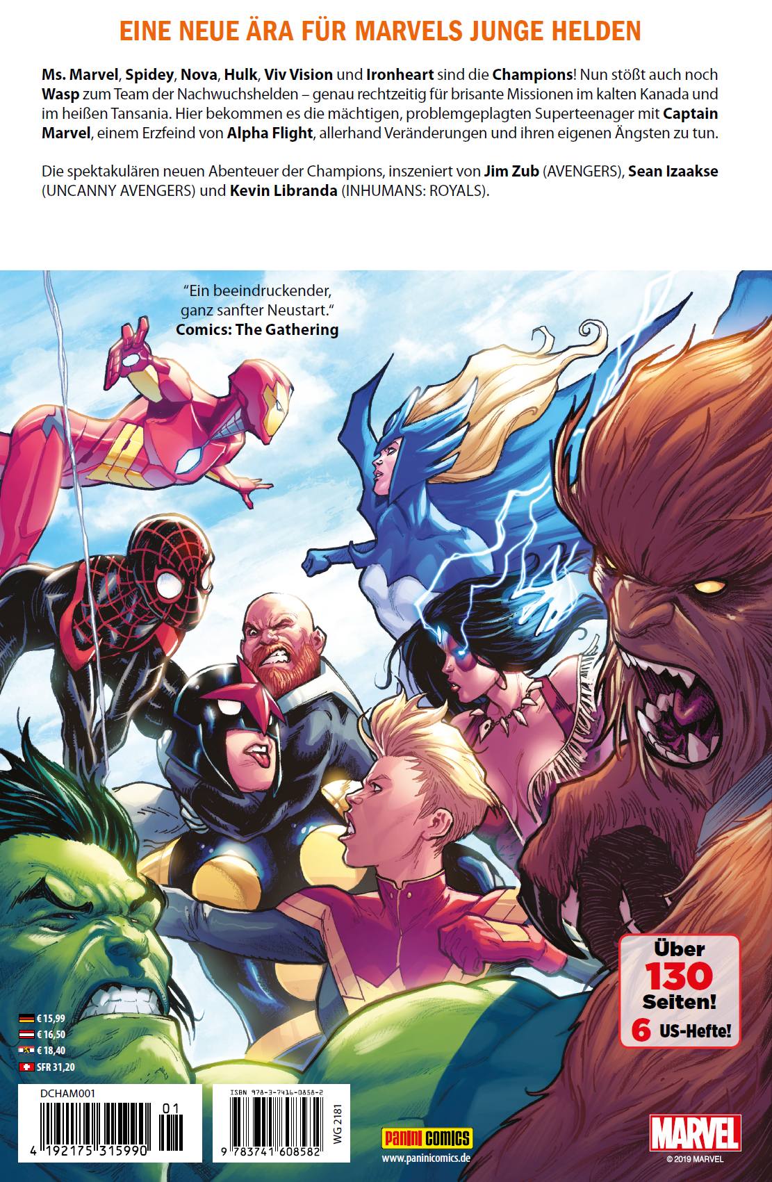 MÄCHTIGER NACHWUCHS von Christian EndresVor einiger Zeit stießen die junge Inhuman-Gestaltwandlerin Ms. Marvel Kamala Khan, Nachwuchsnetzschwinger Miles Morales und Hitzkopf Nova Sam Alexander zu den Avengers. Nachdem sie von ihren erfahrenen Kollegen einmal zu oft enttäuscht wurden, gründeten die Helden der nächsten Generation schließlich ihr eigenes Team: die Champions! Auf ihren Missionen, auf denen sie alles besser machen wollten als die erwachsenen Heroen, wurden sie noch durch den zeitversetzten jungen Cyclops, den genialen Hulk Amadeus Cho, Visions künstlich-menschliche Tochter Viv und zuletzt Ironheart Riri Williams verstärkt. In diesem Band beginnt nach ihren Abenteuern in der AVENGERS-Heftserie und im Sonderheft AVENGERS SPECIAL: CHAMPIONS - DAS FINALE nun eine neue Ära für die jungen Helden. Die erste Storyline spielt dabei noch vor HULK 6 von Ende 2018 und vor dem Champions- Zweiteiler in unserem INFINITY COUNTDOWN MEGABAND von Anfang 2019 - erst die letzten drei Storys im vorliegenden Band setzen dann nach diesen Ausgaben ein. Keine große Sache, mehr dazu auf der hinteren Redaktionsseite. Viel Spaß mit den neuen Abenteuern der Champions!