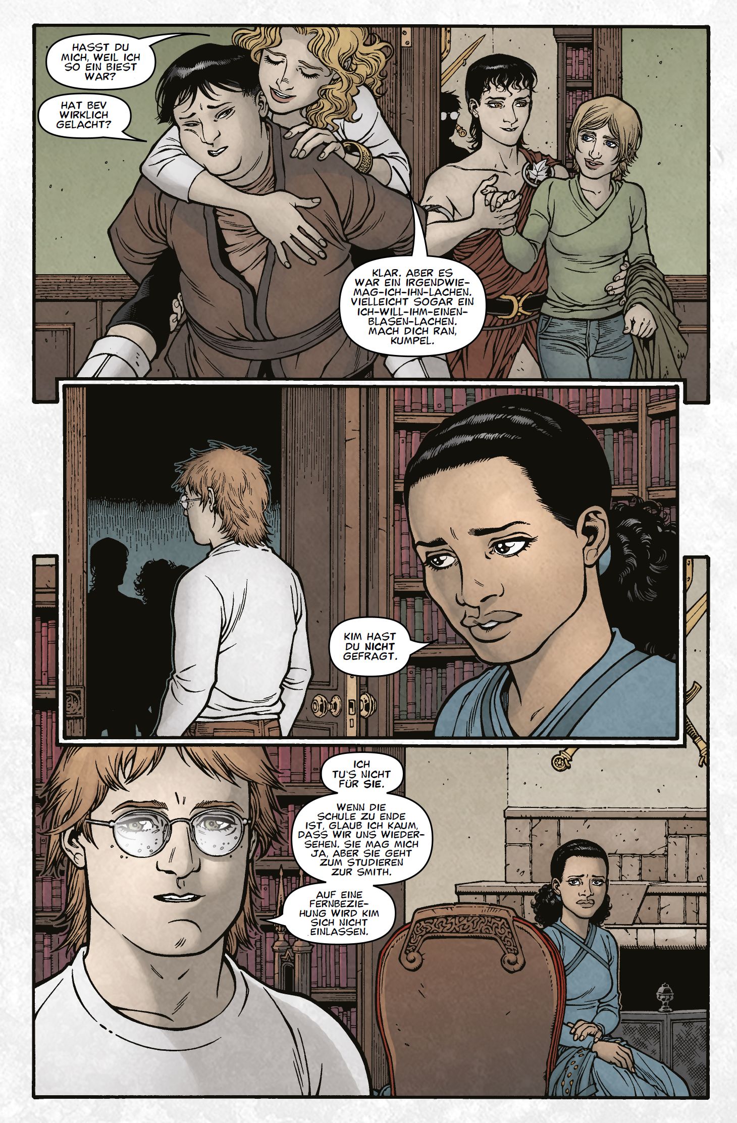 DER SCHLÜSSEL ZUM KÖNIGREICH Was bisher geschah… von Christian Endres Dieser Sammelband präsentiert das große Finale des Comic-Meisterwerks LOCKE & KEY von Joe Hill und Gabriel Rodríguez. Im Mittelpunkt der Saga stehen die Geschwister Tyler, Kinsey und Bode Locke. Ihr Vater Rendell wurde von seinen Schülern Al Grubb und Sam Lesser umgebracht. Darum zogen die Locke-Kids mit ihrer Mutter Nina auf die Insel Lovecraft in der Massachusetts Bay und in das alte Keyhouse der Familie Locke, zu der noch Rendells Bruder Duncan gehört. Was keiner von ihnen wissen konnte – hinter dem Mord an Rendell steckte ein Wesen, das im Laufe der Jahre schon viele Gestalten annahm: Die von Rendells Jugendfreund Lucas “Dodge” Caravaggio; die einer Frau im Brunnenschacht des Keyhouse, die den Mord an Vater Locke aus der Ferne anstiftete und orchestrierte; und die des Schülers Zack Wells. In dieser Identität schlich sich das Böse schließlich direkt ins Leben der Locke-Geschwister und gewann sogar das Herz von Kinsey, obwohl auch deren Mitschüler Scot und Jamal für sie schwärmen – mit ihnen stieg sie einmal sogar hinab in die Höhle am Meer, die bei Flut gefährlich wird und wo die Namen von Rendell und seiner Clique aus den 80ern an eine Wand geschrieben sind. [...]