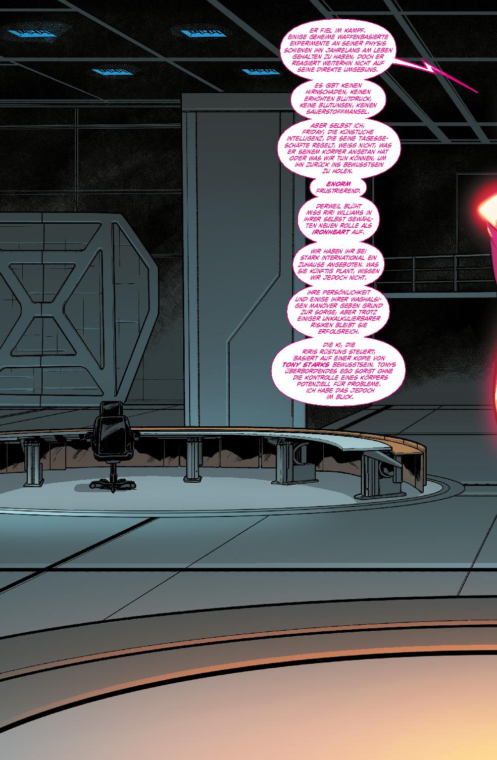 Seit dem zweiten Superheldenkrieg hat Tony Stark im Koma gelegen - doch jetzt ist er plötzlich verschwunden! Bevor seine Freunde und Verbündete sich auf die Suche nach ihm machen können, haben sie eigene Probleme zu bewältigen: Seine Mutter Amanda Armstrong, seine Assistentin Mary Jane Watson und seine Nachfolgerin Ironheart Riri Williams müssen um Tonys Firma und Vermächtnis kämpfen. Und der neue Iron Man Dr. Doom bekommt es mit einem Gefängnisausbruch zahlreicher Superschurken zu tun, die alle noch eine Rechnung mit ihm offen haben...