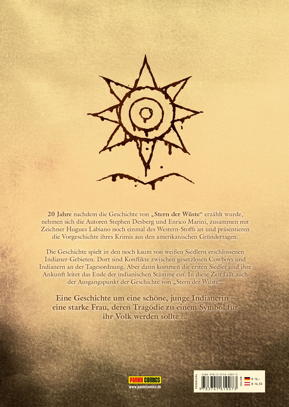 20 Jahre nachdem die Geschichte von "Stern der Wüste" erzählt wurde, nehmen sich die Autoren Stephen Desberg und Enrico Marini, zusammen mit Zeichner Hugues Labiano noch einmal des Western-Stoffs an und präsentieren die Vorgeschichte ihres Krimis aus den amerikanischen Gründertagen.Die Geschichte spielt in den noch kaum von weißen Siedlern erschlossenen Indianer-Gebieten. Dort sind Konflikte zwischen gesetzlosen Cowboys und Indianern an der Tagesordnung. Aber dann kommen die ersten Siedler und ihre Ankunft leitet das Ende der indianischen Stämme ein. In diese Zeit fällt auch der Ausgangspunkt der Geschichte von "Stern der Wüste".Eine Geschichte um eine schöne, junge Indianerin - eine starke Frau, deren Tragödie zu einem Symbol für ihr Volk werden sollte ...