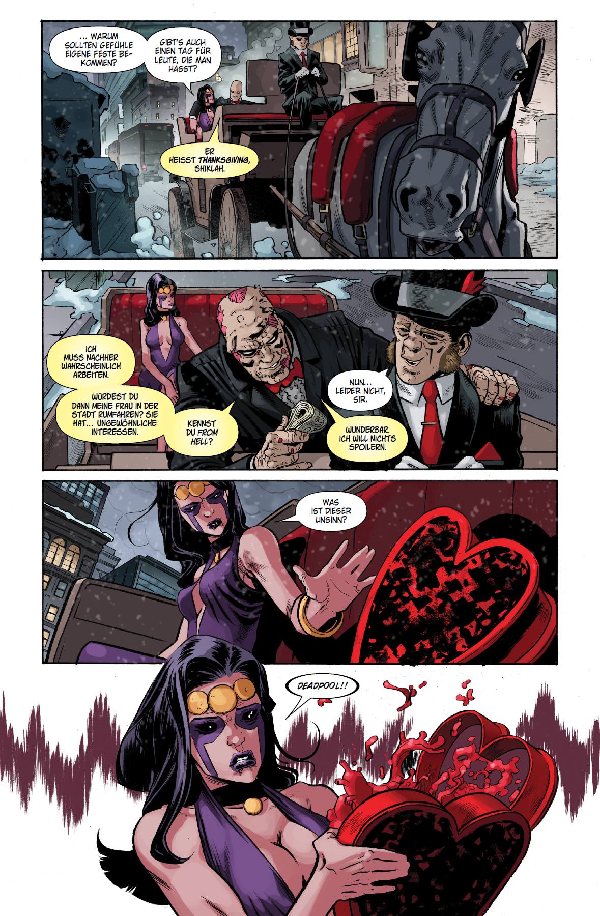 HERZKLOPFEN… von Thomas Witzler Die stürmische Romanze mit Shiklah war für Deadpool die vielleicht aufregendste Zeit seines Lebens. Er bereiste die halbe Welt und bekämpfte an ihrer Seite allerlei Gefahren. Am Ende führte der regenerierende Degenerierte seine eigenwillige Braut vor den Traualtar, um Dracula, den Herrn der Vampire auszustechen, der es ebenfalls auf sie abgesehen hatte. Aber die Flitterwochen sind vorbei und die harte Realität des Ehealltags hat die einstigen Turteltauben eingeholt. Wade fand zunehmend weniger Zeit, sich seiner Frau ausgiebig zu widmen. In allen Belangen. Immerhin ist Shiklah ein Sukkubus, eine Dämonin, die sich von der Lebensenergie der Menschen ernährt, mit denen sie sich paart. Außerdem regiert sie ein Königreich voller Monster, das sich in riesigen Gewölben unter Manhattan befindet. Kürzlich erwischte Wade seine Frau in flagranti mit ihrem Liebhaber Jack Russell alias Werwolf in der Nacht. Damit nicht genug, läuft der wahnsinnige und sadistische Madcap immer noch frei herum und sinnt auf schreckliche Rache an Deadpool…