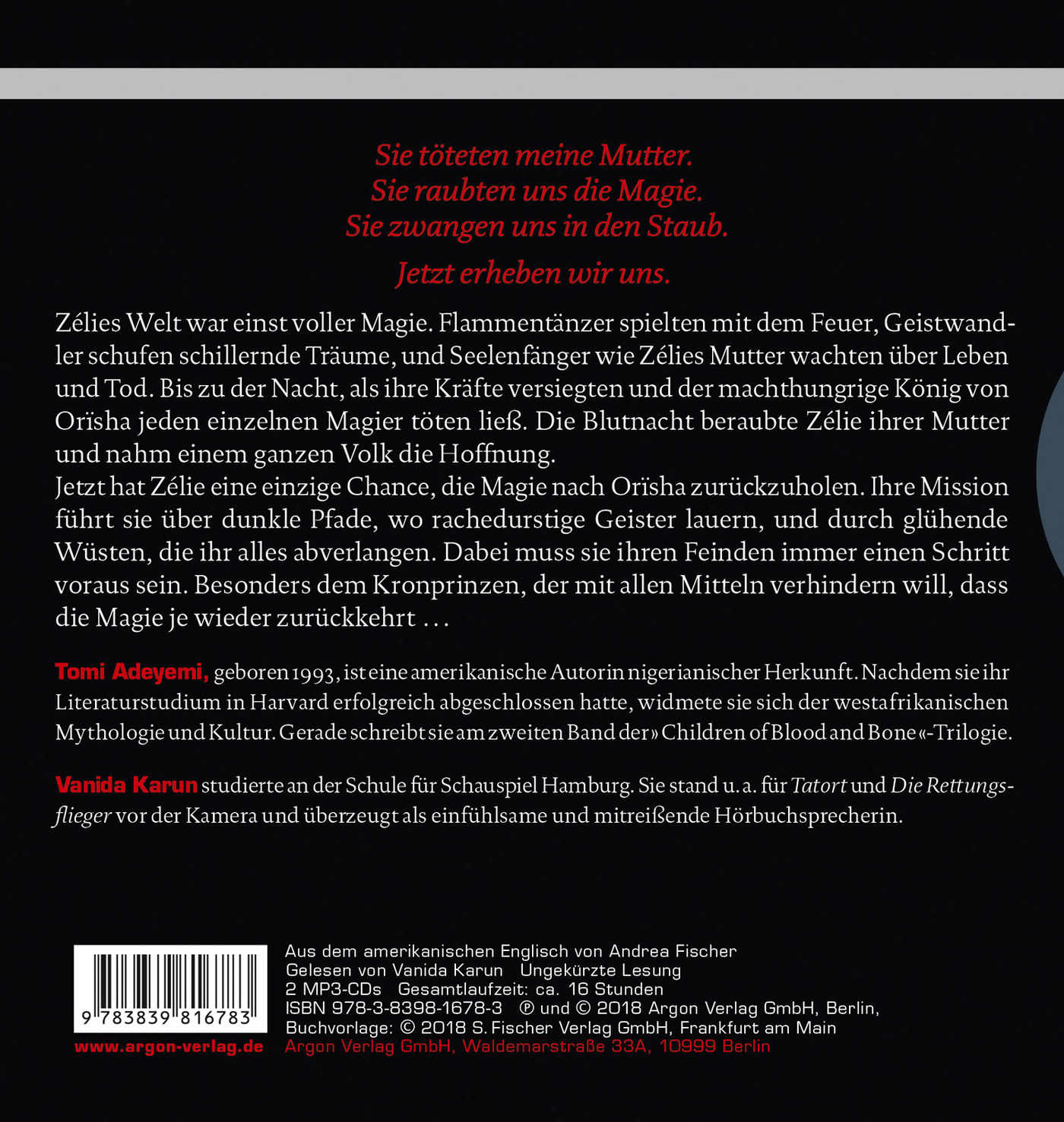 Das internationale Fantasy-Ereignis des Jahres!Zélies Welt war einst voller Magie. Flammentänzer spielten mit dem Feuer, Geistwandler schufen schillernde Träume, und Seelenfänger wie Zélies Mutter wachten über Leben und Tod. Bis zu der Nacht, als ihre Kräfte versiegten und der machthungrige König von Orïsha jeden einzelnen Magier töten ließ. Die Blutnacht beraubte Zélie ihrer Mutter und nahm einem ganzen Volk die Hoffnung. Jetzt hat Zélie eine einzige Chance, die Magie nach Orïsha zurückzuholen. Ihre Mission führt sie über dunkle Pfade, wo rachedurstige Geister lauern, und durch glühende Wüsten, die ihr und ihrer treuen Löwenesse alles abverlangen. Dabei muss sie ihren Feinden immer einen Schritt voraus sein. Besonders dem Kronprinzen, der mit allen Mitteln verhindern will, dass die Magie je wieder zurückkehrt ...Vanida Karun versteht es, die Magie dieses Romans hörbar zu machen. Mit ihrer unwiderstehlichen Altstimme zieht sie uns hinein in die faszinierende Welt von Orisha.