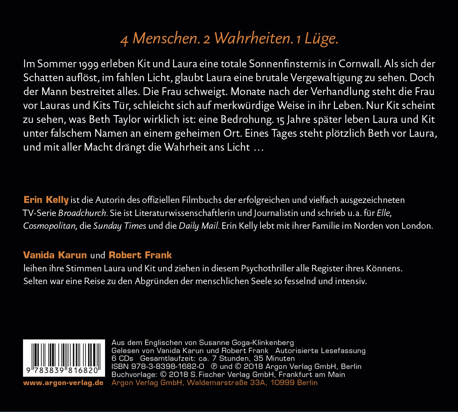 | Schlagworte | Betrug • Cornwall • Falschaussage • Feigheit • Lizard Point • London • Lüge • Panikattacken • Sonnenfinsternis • Totalität • Vergewaltigung • Wahrheit |