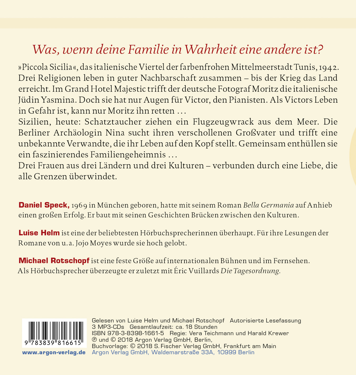 »Piccola Sicilia«, das italienische Viertel der lebensfrohen Mittelmeerstadt Tunis, 1942. Drei Religionen leben in guter Nachbarschaft zusammen - bis der Krieg das Land erreicht. Im Grand Hotel Majestic begegnet der deutsche Fotograf Moritz der Liebe seines Lebens, dem Zimmermädchen Yasmina. Doch sie hat nur Augen für Victor, den charmanten Pianisten. Als Victors Leben auf dem Spiel steht, kann nur Moritz ihn retten ... Sizilien, heute: das Mittelmeer, glitzerndes Blau. Schatztaucher ziehen ein altes Flugzeugwrack aus der Tiefe. Die Berliner Archäologin Nina sucht ihren verschollenen Großvater Moritz und trifft eine unbekannte Verwandte aus Haifa, die ihr Leben verändert. Gemeinsam enthüllen sie ein faszinierendes Familiengeheimnis. Drei Frauen aus drei Ländern und drei Kulturen - verbunden durch eine Liebe, die alle Grenzen überwindet.