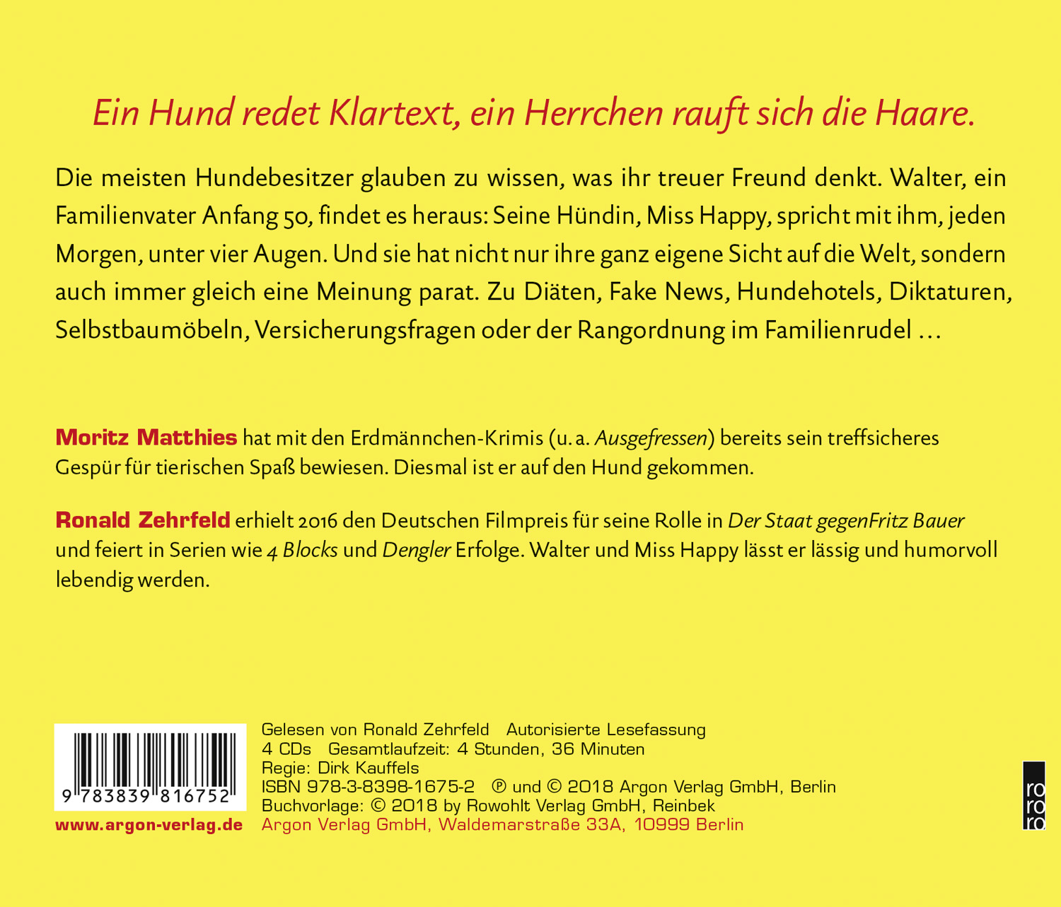| Schlagworte | Berlin • Erdmännchen • Familie • Hans Rath • Haustier • Herrchen • Hund • Hundefreundschaft • Känguru-Prinzip • Labrador • Moritz Matthies • Philosophie • Weisheit |
