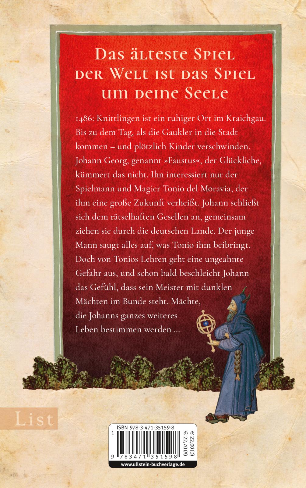 1486: Knittlingen ist ein ruhiger Ort im Kraichgau. Bis zu dem Tag, als die Gaukler in die Stadt kommen - und plötzlich Kinder verschwinden. Johann Georg, genannt "Faustus", der Glückliche, kümmert das nicht. Ihn interessiert nur der Spielmann und Magier Tonio del Moravia: Von dem blassen Mann mit den stechend schwarzen Augen, der Johann eine große Zukunft als Gelehrter voraussagt, geht eine seltsame Faszination aus. Johann schließt sich ihm an, gemeinsam ziehen sie durch die deutschen Lande. Der junge Mann saugt alles auf, was Tonio ihm beibringt. Doch von Tonios Lehren geht eine ungeahnte Gefahr aus, und schon bald beschleicht Johann das Gefühl, dass sein Meister mit dunklen Mächten im Bunde steht. Mächte, die Johanns ganzes weiteres Leben bestimmen werden ...