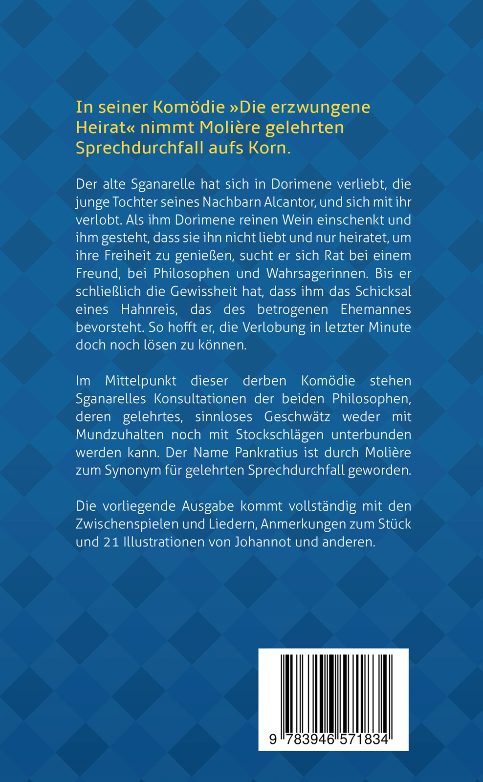 Molières »Die erzwungene Heirat« als vollständige Ausgabe mit den Zwischenspielen, Liedern, Anmerkungen zum Werk und 21 Textillustrationen.