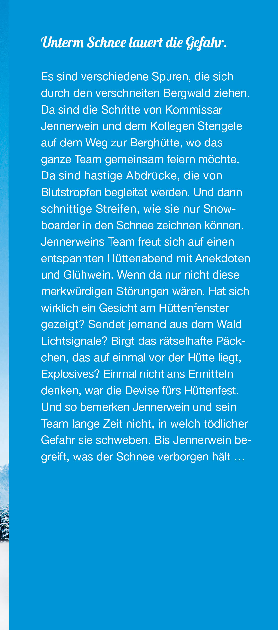 In einer verschneiten Berghütte hoch über dem idyllisch gelegenen Kurort will Kommissar Jennerwein mit seinem Team feiern. Einmal ohne Ermittlungsdruck und Verbrecherjagd gemütlich am Kaminfeuer sitzen und Geschichten erzählen. Aber was bedeuten die blutigen Spuren im Schnee, die draußen zu sehen sind? Warum kreist eine Drohne über der Hütte? Und welcher unheimliche Schatten streift durch die Nacht? Während drunten im Kurort die Polizeistation verwaist ist und eine Gestalt leblos in einem versperrten Keller liegt, erkennt Jennerwein, dass er in eine Falle geraten ist, aus der es kein Entkommen gibt. Wenn er sein Team retten will, muss er mit dem Tod Schlitten fahren...
