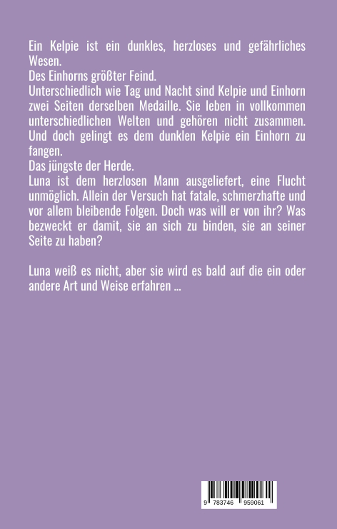Ein Kelpie ist ein dunkles, herzloses und gefährliches Wesen. Des Einhorns größter Feind.Unterschiedlich wie Tag und Nacht sind Kelpie und Einhorn zwei Seiten derselben Medaille. Sie leben in vollkommenunterschiedlichen Welten und gehören nicht zusammen. Und doch gelingt es dem dunklen Kelpie ein Einhorn zu fangen.Das jüngste der Herde.Luna ist dem herzlosen Mann ausgeliefert, eine Flucht unmöglich. Allein der Versuch hat fatale, schmerzhafte undvor allem bleibende Folgen. Doch was will er von ihr? Was bezweckt er damit, sie an sich zu binden, sie an seiner Seite zu haben?Luna weiß es nicht, aber sie wird es bald auf die ein oder andere Art und Weise erfahren ...