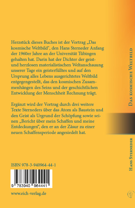 Hans Sterneder zeichnet das Bild einer Denkweise, die unserer heutigen Zeit sehr fremd geworden ist, die aber das Potential hat, aus Not, Elend und Vereinsamung unserer Zeit hinauszuführen. Sein kosmisches Weltbild greift zurück auf ein Urwissen, das allen alten Kulturen und Religionen eigen war. Es stellt der geist- und herzlosen, materialistischen Weltanschauung unserer Tage ein geisterfülltes und auf den Ursprung alles Lebens ausgerichtetes kosmisch-geistiges Weltbild entgegen, das sowohl den Zusammenhängen des Seins als auch der geschichtlichen Entwicklung der Menschheit gerecht wird. Hans Sterneders ist der große Mystiker des 20. Jahrhunderts. Wie kaum einem anderen Dichter war es ihm gegeben, die tiefen Erkenntnisse seiner spirituellen Weltsicht in einer poetisch gehobenen und doch leicht verständlichen Sprache darzubringen."Das kosmische Weltbild" gehört zum Spätwerk des Dichters. Herzstück dieses Buches ist ein Vortrag, den der Dichter an der Universität Tübingen gehalten hat und in dem er in kurzen Zügen die Entwicklungsgeschichte der Menschheit aufrollt und in Beziehung setzt zum kosmisch-geistigen Urwissen.Ergänzt wird der Vortrag durch weitere Aufsätze Hans Sterneders: Der Geist als Urgrund aller Schöpfung Das Atom - Der Schlüssel zur Gesitwissenschaft Das A und O alles Seins Bericht über mein Schaffen und meine Entdeckungen
