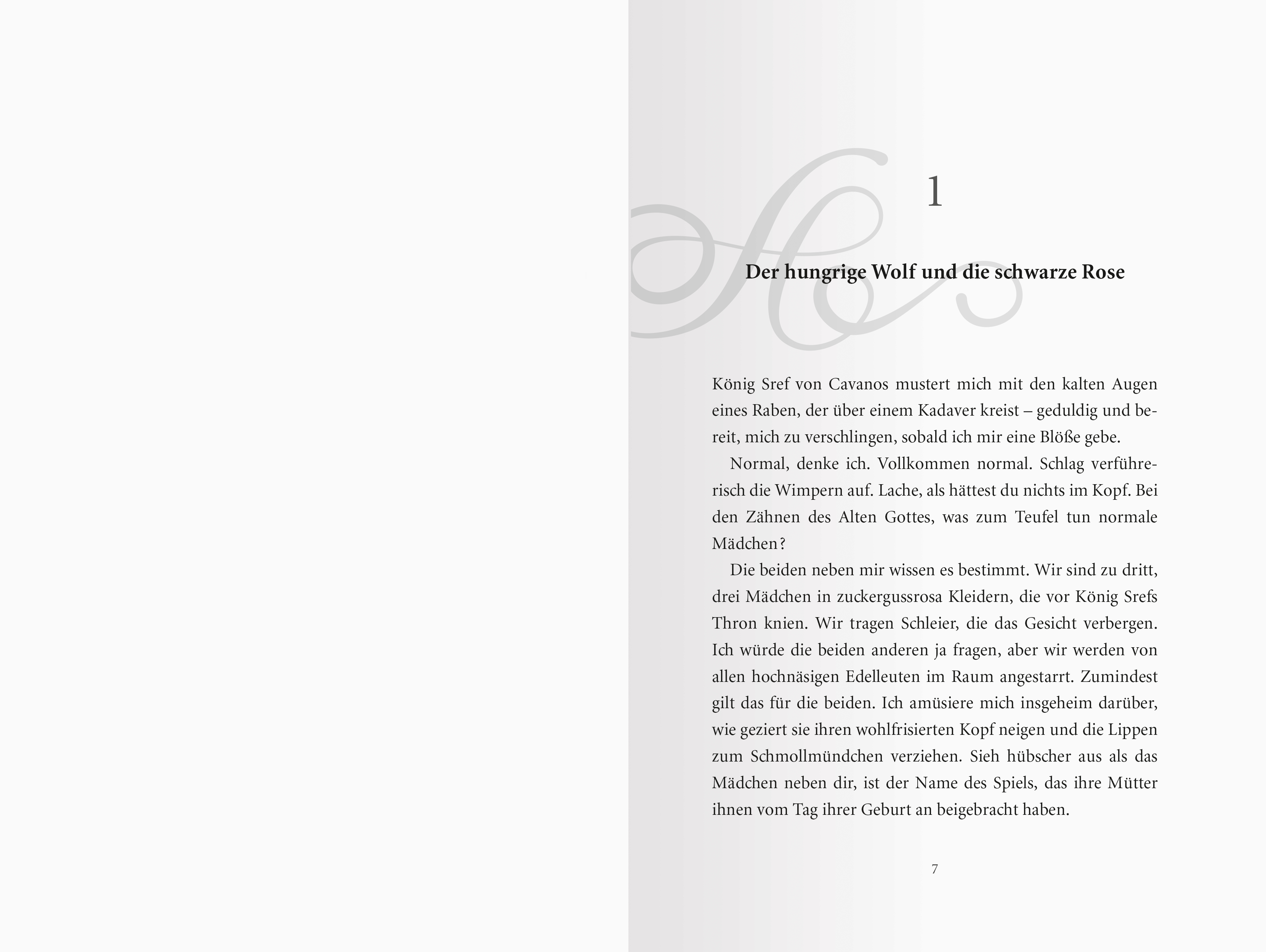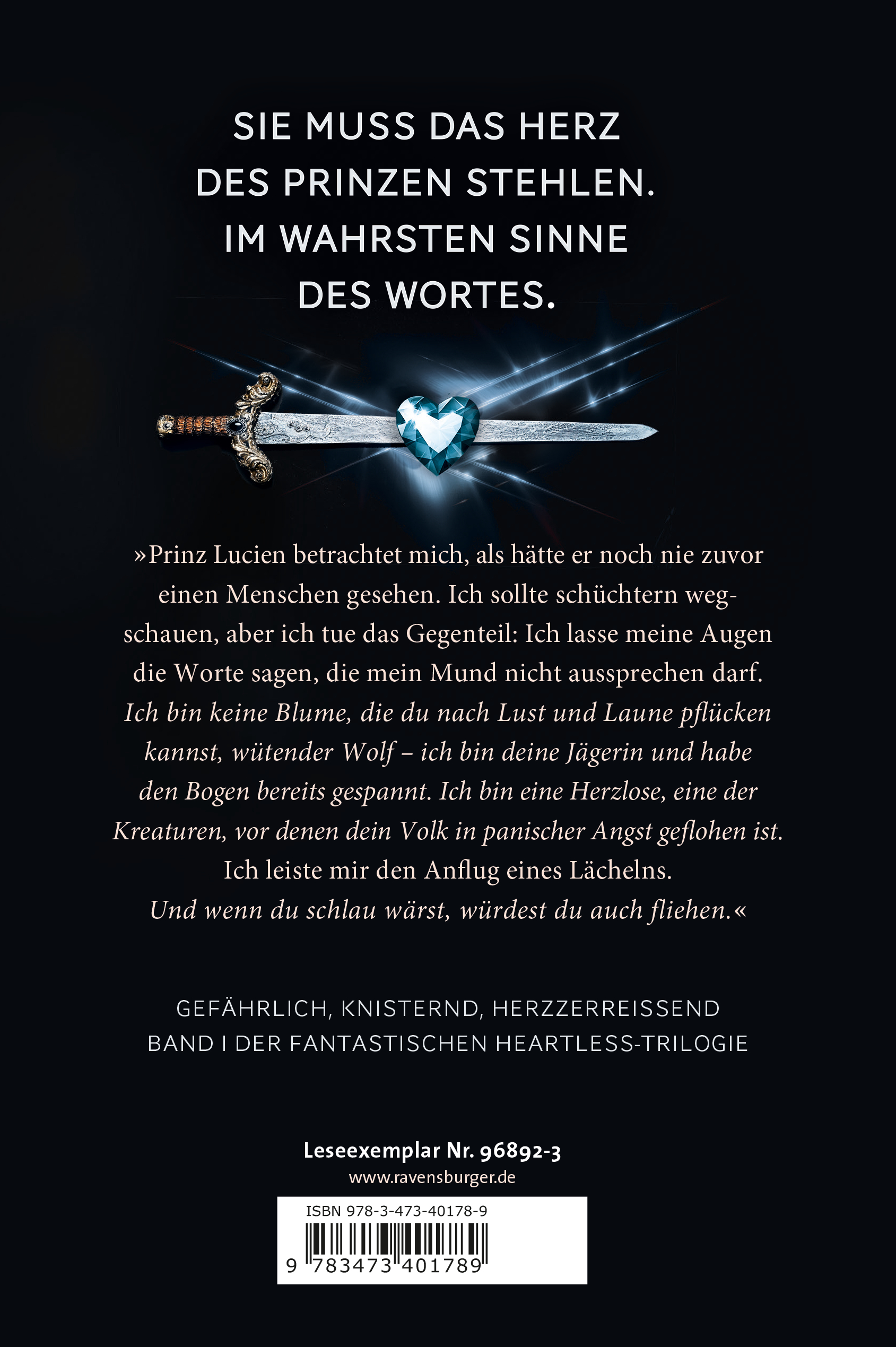 Wieder blicke ich Prinz Lucien ins Gesicht. Er betrachtet mich, als hätte er noch nie zuvor einen Menschen gesehen. Ich sollte wegschauen und mich schüchtern geben, aber ich tue das Gegenteil: Ich lasse meine Augen die Worte sagen, die mein Mund nicht aussprechen darf. "Ich bin keine Blume, die du nach Lust und Laune pflücken kannst, wütender Wolf - ich bin deine Jägerin und habe den Bogen bereits gespannt. Ich bin eine Herzlose, eine der Kreaturen, vor denen dein Volk in panischer Angst geflohen ist." Ich leiste mir den Anflug eines Lächelns." Und wenn du schlau wärst, würdest du auch fliehen."
