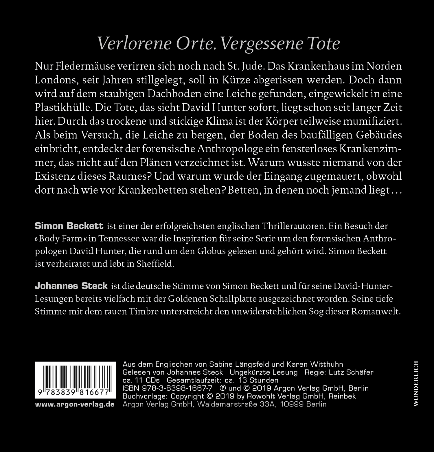 Nur Fledermäuse verirren sich noch nach St. Jude. Das stillgelegte Krankenhaus im Norden Londons soll in Kürze abgerissen werden. Doch dann wird auf dem staubigen Dachboden eine Leiche gefunden, eingewickelt in eine Plastikhülle. Die Leiche, das sieht Dr. David Hunter sofort, liegt dort schon seit langer Zeit. Durch das trockene Klima ist der Körper teilweise mumifiziert. Als der forensische Anthropologe den Fund näher untersucht, stellt er fest, dass es sich um eine Frau handelt. Eine schwangere Frau. Beim Versuch, die Tote zu bergen, entdeckt die Polizei ein fensterloses Krankenzimmer, das nicht auf den Plänen verzeichnet ist. Warum wurde der Eingang zugemauert, obwohl dort nach wie vor Krankenbetten stehen? Betten, in denen noch jemand liegt …