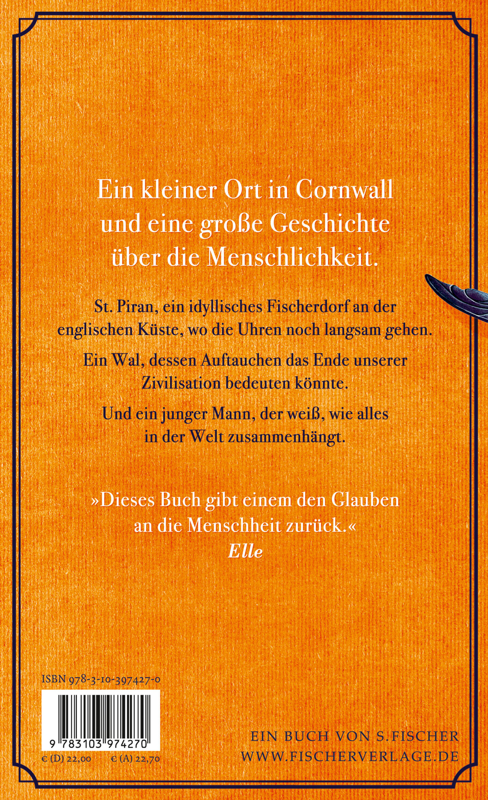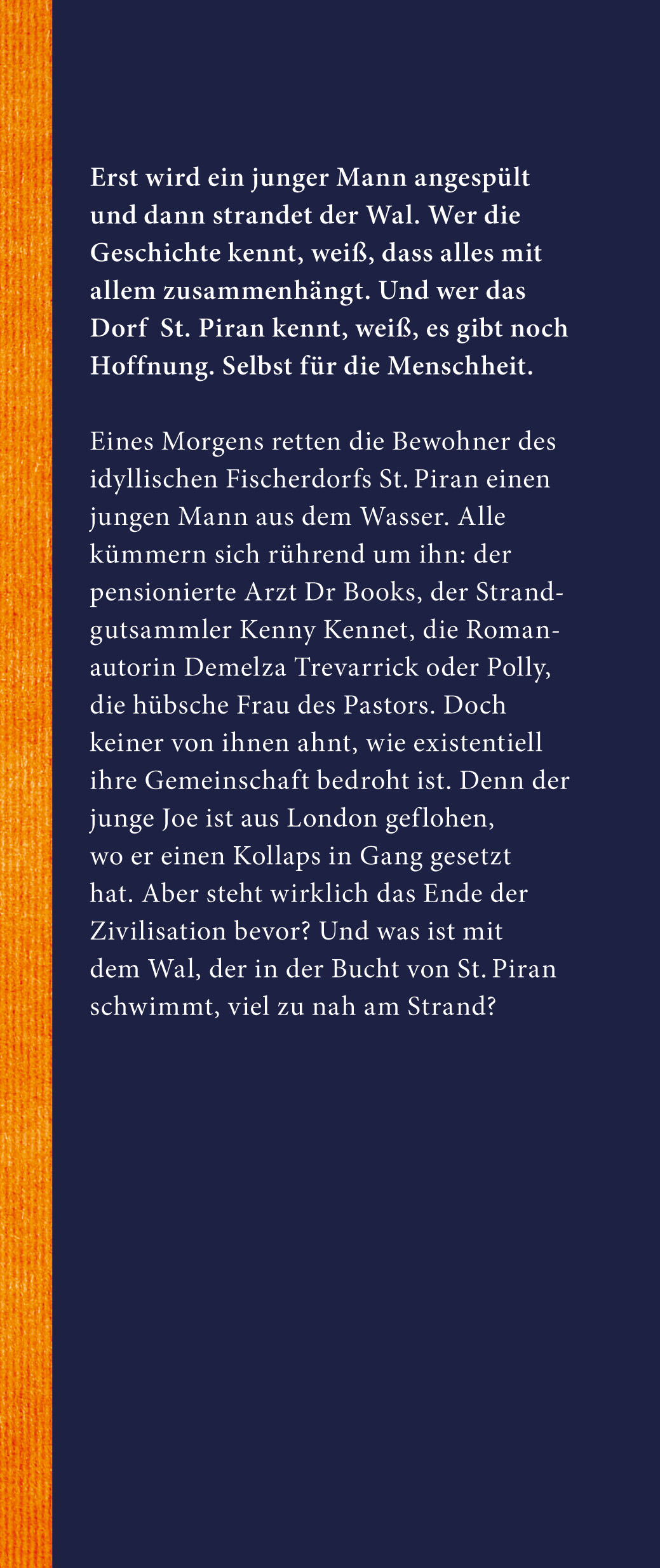 Erst wird ein junger Mann angespült, und dann strandet der Wal. Die dreihundertsieben Bewohner des Fischerdorfs St. Piran spüren sofort: Hier beginnt etwas Sonderbares. Doch keiner ahnt, wie existentiell ihre Gemeinschaft bedroht ist. So wie das ganze Land. Und vielleicht die ganze Welt. Weil alles mit allem zusammenhängt.