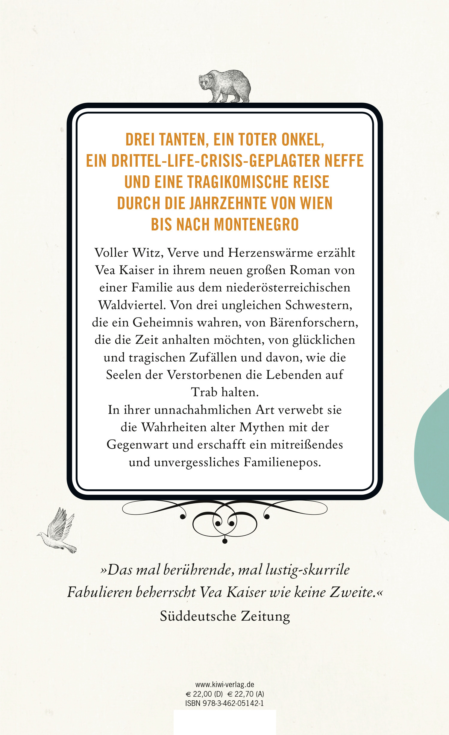 Voller Verve, Witz und Herzenswärme erzählt Vea Kaiser von einer Familie aus dem niederösterreichischen Waldviertel, von drei Schwestern, die ein Geheimnis wahren, von Bärenforschern, die die Zeit anhalten möchten, und von den Seelen der Verstorbenen, die uns begleiten, ob wir wollen oder nicht.