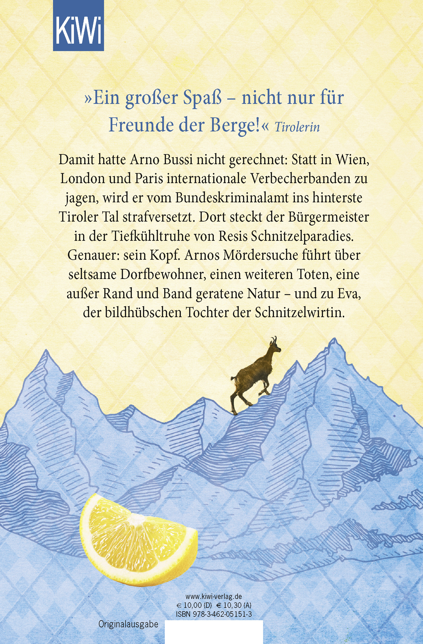 Damit hatte der Arno nicht gerechnet: Statt in Wien, London und Paris internationale Verbrecherbanden zu jagen, wird er vom Bundeskriminalamt ins hinterste Tiroler Tal strafversetzt. Immerhin bekommt er dort gleich die erste Leiche serviert. Erwischt hat's den Bürgermeister von Vorderkitzlingen. Er steckt in der Tiefkühltruhe von Resis Schnitzelparadies in Hinterkitzlingen. Genauer gesagt: sein Kopf. Und weil ein gewaltiges Unwetter über das Tal hereinbricht, ist Arno Bussi ganz auf sich allein gestellt.