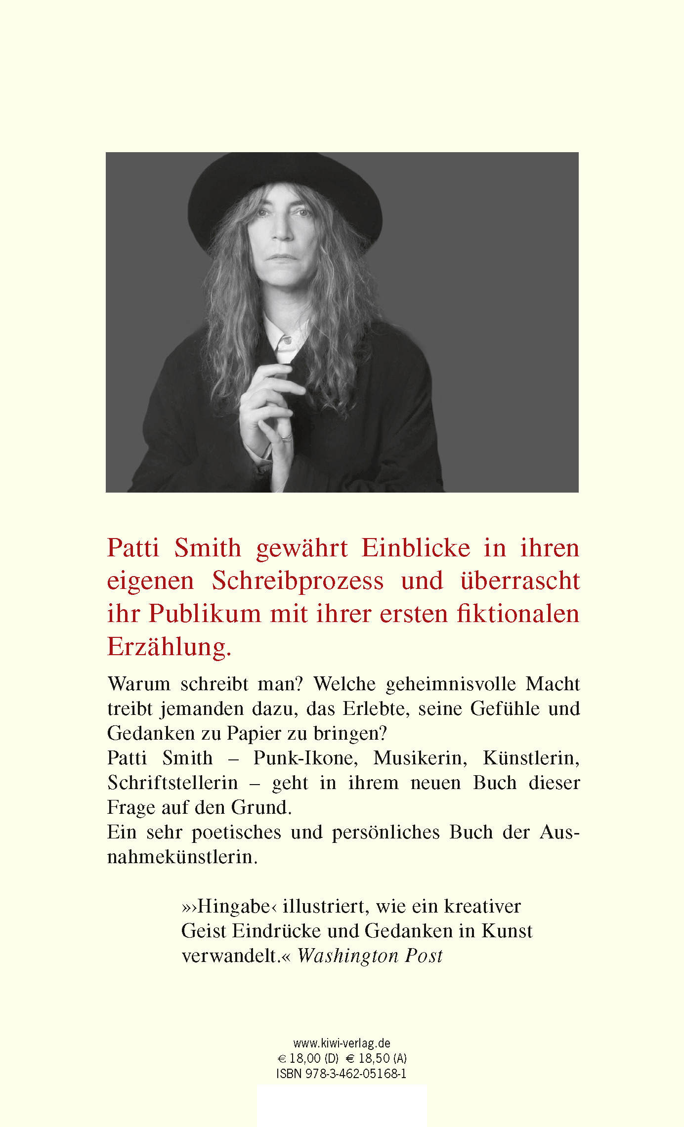 Punk-Ikone, Musikerin, Künstlerin, Schriftstellerin. Mühelos füllt Patti Smith all diese Rollen aus. In »Hingabe« veröffentlicht sie ihre erste literarische Erzählung und gewährt Einblicke in ihren Schreibprozess.