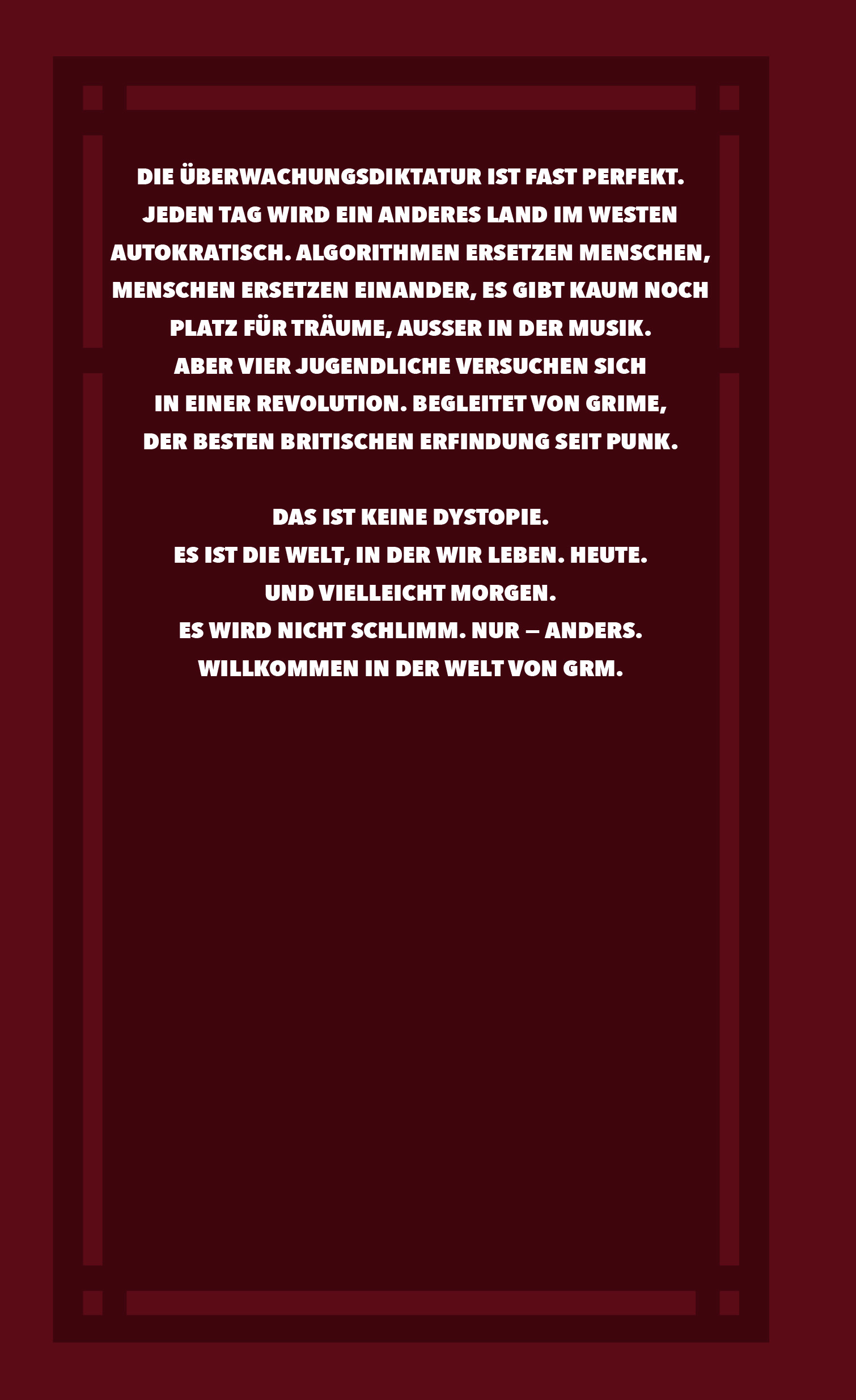 Die Brave New World findet in wenigen Jahren statt. Vielleicht hat sie auch schon begonnen. Jeden Tag wird ein anderes westliches Land autokratisch. Algorithmen, die den Menschen ersetzen, liegen als Drohung in der Luft. Großbritannien, wo der Kapitalismus einst erfunden wurde, hat ihn inzwischen perfektioniert. Aber vier Kinder spielen da nicht mit – sondern gegen die Regeln. Und das mit aller Konsequenz. Willkommen in der Welt von GRM.