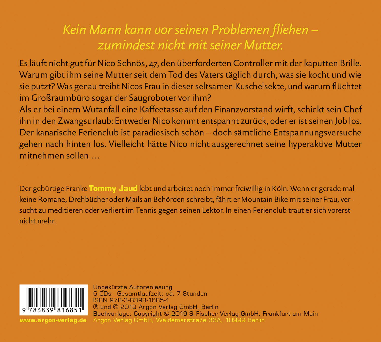 Es läuft nicht gut für Nico Schnös, 47, den überforderten Controller mit der kaputten Brille. Warum gibt ihm seine Mutter seit dem Tod des Vaters täglich durch, was sie kocht und wie sie putzt? Was genau treibt Nicos Frau in dieser seltsamen Kuschelsekte, und warum flüchtet im Großraumbüro sogar der Saugroboter vor ihm? Als er bei einem Wutanfall eine Kaffeetasse auf den Finanzvorstand wirft, schickt sein Chef ihn in den Zwangsurlaub: Entweder Nico kommt entspannt zurück, oder er ist seinen Job los. Der kanarische Ferienclub ist paradiesisch schön – doch sämtliche Entspannungsversuche gehen nach hinten los. Vielleicht hätte Nico nicht ausgerechnet seine hyperaktive Mutter mitnehmen sollen: »Eine Zimmerkarte reicht, mein Sohn und ich machen eh alles zusammen!« Bald schon ahnt Nico: Paradies und Hölle können sehr nah beieinander liegen.
