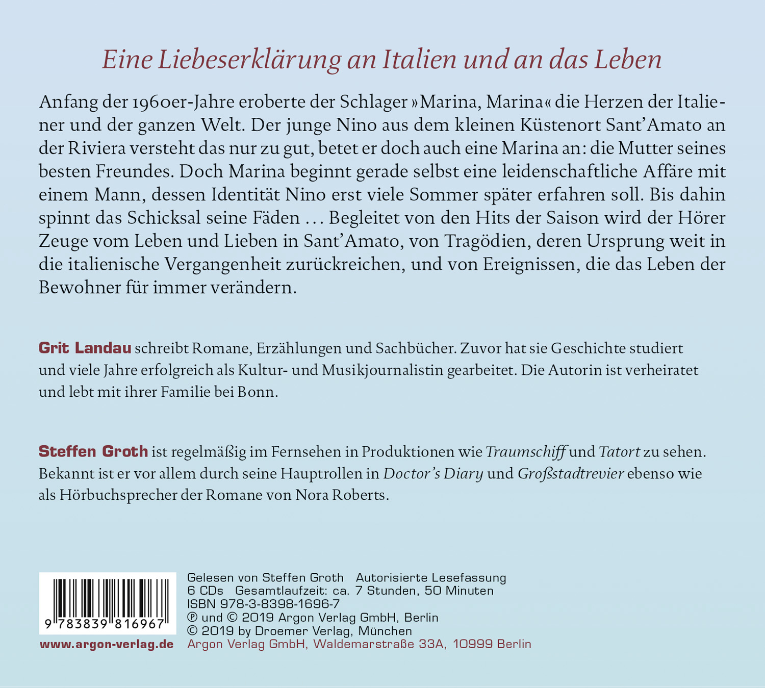 Landau, Grit Grit Landau, Jahrgang 1973, schreibt Romane, Erzählungen und Sachbücher (letztere unter ihrem bürgerlichen Namen ). Zuvor hat sie Geschichte studiert und viele Jahre erfolgreich als Kultur- und Musikjournalistin gearbeitet. Die Leidenschaft für Italien liegt der Autorin im Blut: Schon ihr Vater, ein Opernregisseur und Puccini-Experte, arbeitete mehrfach an der Mailänder Scala. Ihre Mutter krachte 1960 als Zwanzigjährige von einem Hotelbalkon bei Sanremo - quasi der Urknall einer lebenslangen Liebe zu Bella Italia. Die Autorin ist verheiratet und lebt mit ihrer Familie bei Bonn Groth, Steffen Steffen Groth ist regelmäßig im Fernsehen in Produktionen wie "Traumschiff" und "Tatort" zu sehen. Bekannt ist er vor allem durch seine Hauptrollen in "Doctor s Diary" und "Großstadtrevier" ebenso wie als Hörbuchsprecher der Romane von Nora Roberts.