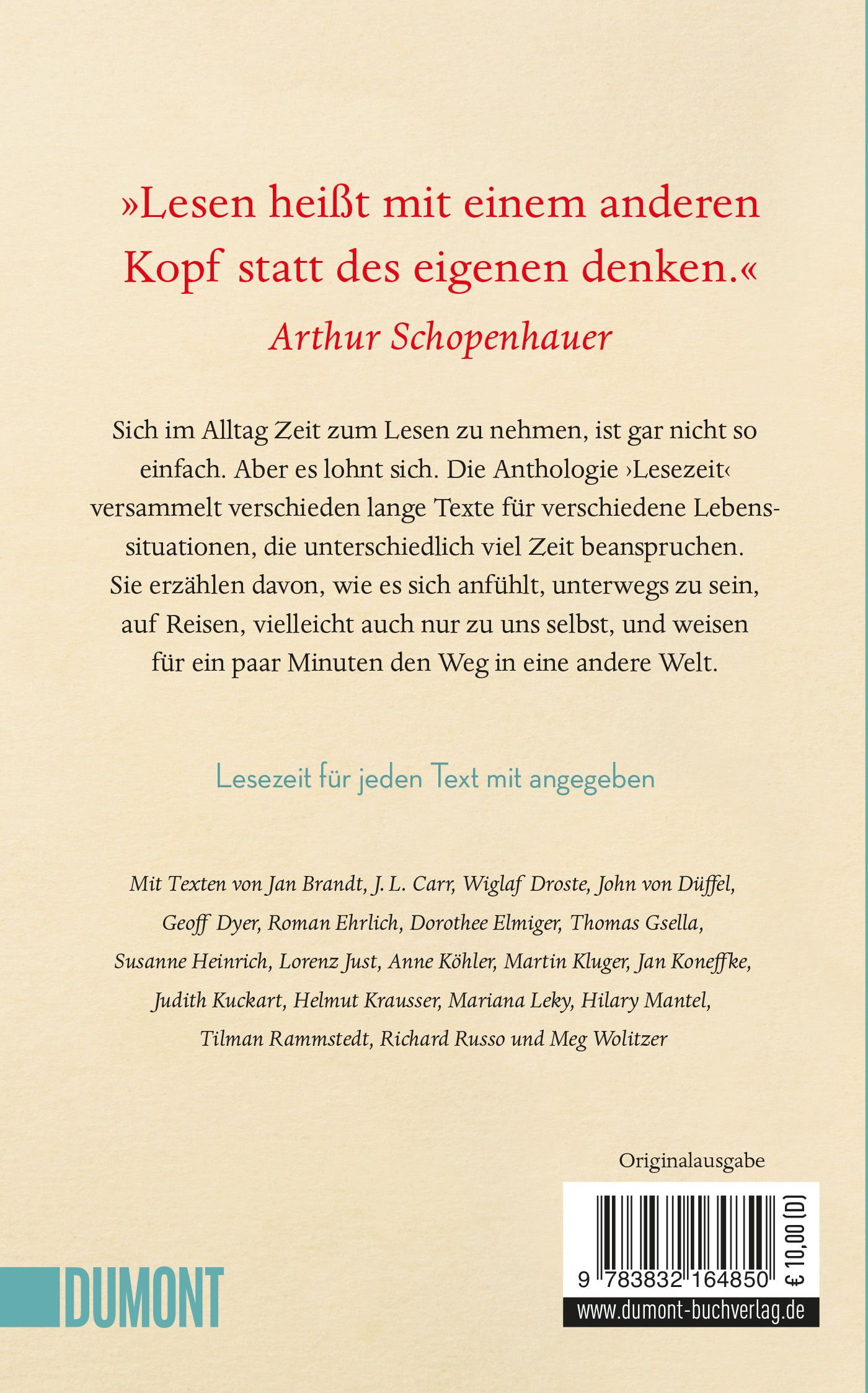 »Lesen heißt mit einem anderen Kopf statt des eigenen denken.«Arthur SchopenhauerSich im Alltag Zeit zum Lesen zu nehmen, ist gar nicht so einfach. Aber es lohnt sich. Die Anthologie 'Lesezeit' versammelt verschieden lange Texte für verschiedene Lebenssituationen, die unterschiedlich viel Zeit beanspruchen. Sie erzählen davon, wie es sich anfühlt, unterwegs zu sein, auf Reisen, vielleicht auch nur zu uns selbst, und weisen für ein paar Minuten den Weg in eine andere Welt. Lesezeit für jeden Text mit angegebenMit Texten von Jan Brandt, J._L. Carr, Wiglaf Droste, John von Düffel, Geoff Dyer, Roman Ehrlich, Dorothee Elmiger, Thomas Gsella, Susanne Heinrich, Lorenz Just, Anne Köhler, Martin Kluger, Jan Koneffke, Judith Kuckart, Helmut Krausser, Mariana Leky, Hilary Mantel, Tilman Rammstedt, Richard Russo und Meg Wolitzer