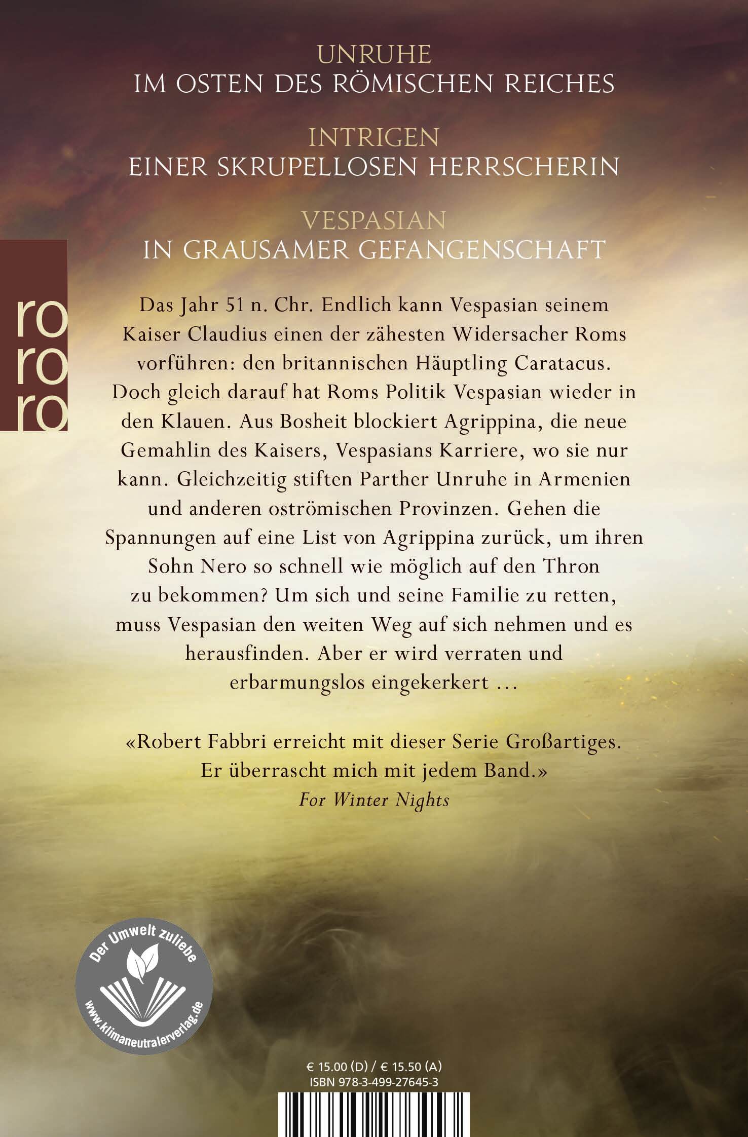Das Jahr 51 n. Chr.: Endlich kann Vespasian seinem Kaiser Claudius einen der zähesten Widersacher Roms vorführen: den britannischen Häuptling Caratacus. Doch gleich darauf hat Roms Politik Vespasian wieder in den Klauen. Aus Bosheit blockiert Agrippina, die neue Gemahlin des Kaisers, Vespasians Karriere, wo sie nur kann. Gleichzeitig stiften Parther Unruhe in Armenien und anderen oströmischen Provinzen. Gehen die Spannungen auf eine List von Agrippina zurück, um ihren Sohn Nero so schnell wie möglich auf den Thron zu bekommen? Um sich und seine Familie zu retten, muss Vespasian den weiten Weg auf sich nehmen und es herausfinden. Aber er wird verraten und erbarmungslos eingekerkert …