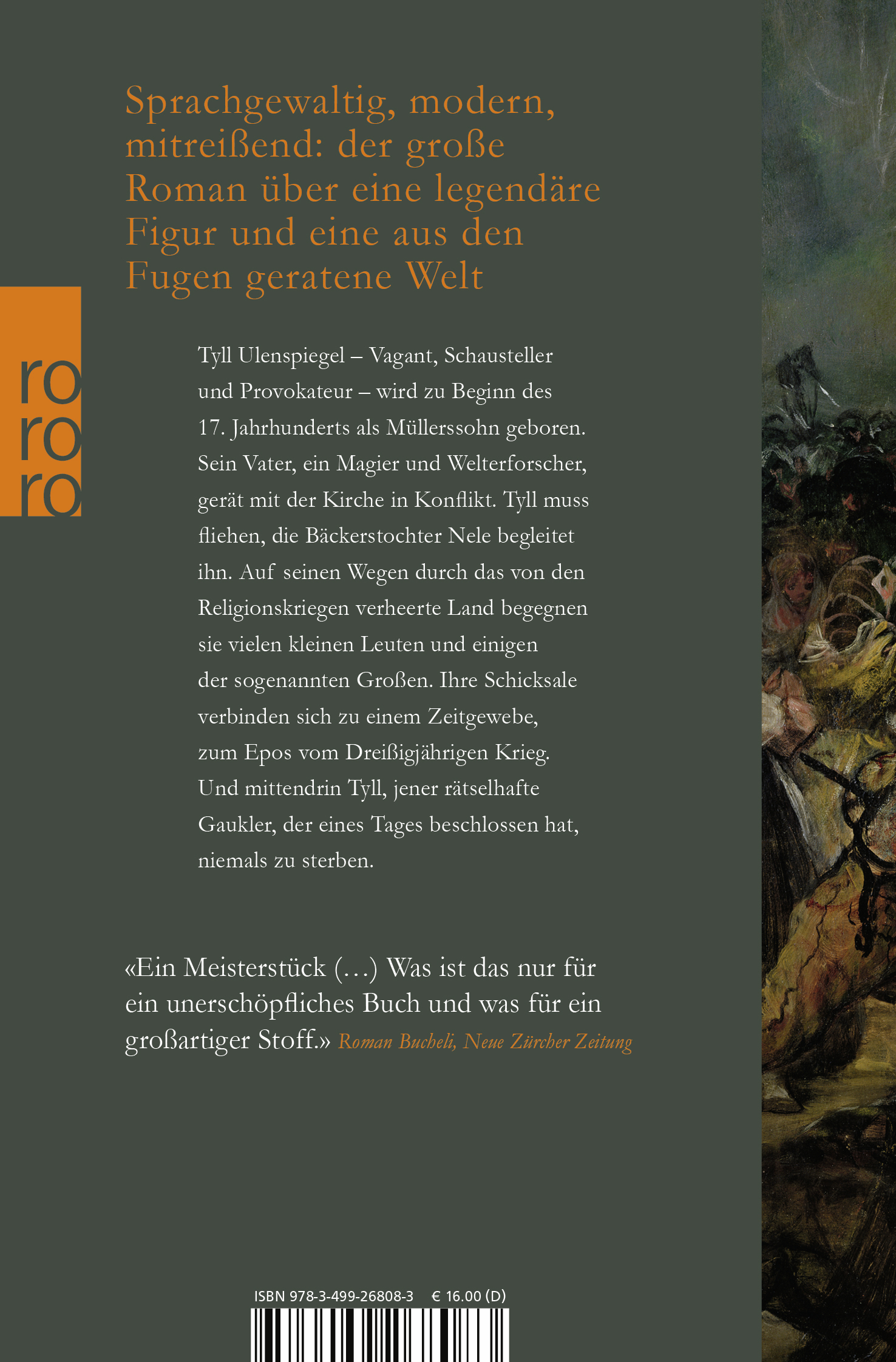 Und jetzt darf ich einen echten Triumph der deutschsprachigen Gegenwartsliteratur anzeigen. Sprachtrunken, bildersatt und verzaubert habe ich den neuen Roman von Daniel Kehlmann zugeklappt: So ein Wunderbuch begegnet einem nicht jedes Jahr! Eindrücklich wie nie gelingt es Kehlmann, rund um den aus dem Spätmittelalter in die Zeit des Dreißigjährigen Krieges verpflanzten Tyll Ulenspiegel einen Mummenschanz um Macht, Machtmissbrauch und den Hochseiltanz unserer Existenz zu inszenieren, der es in sich hat. Hinreißend!