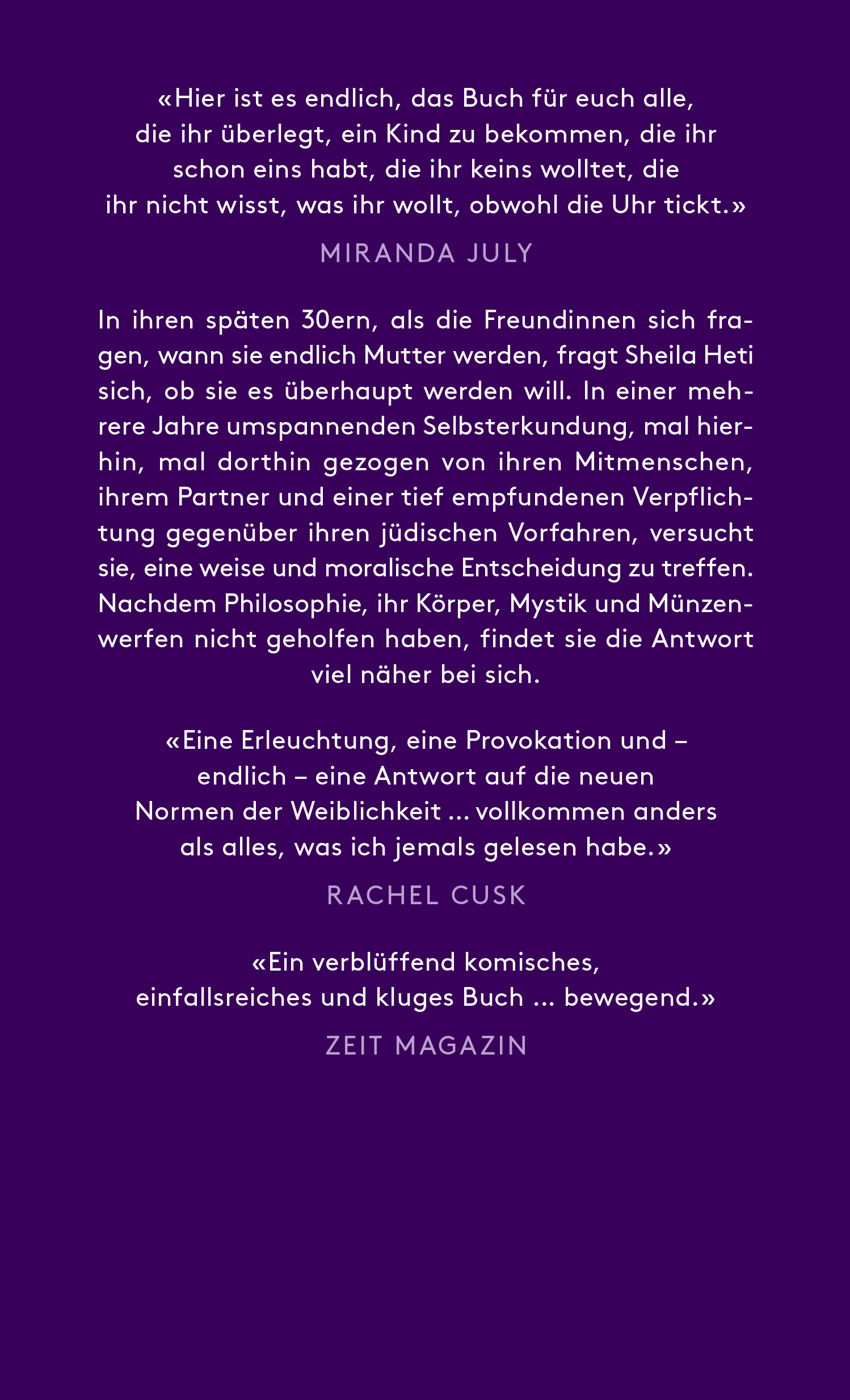 "Diese Erkundung der moralischen, gesellschaftlichen und psychologischen Beziehung der modernen Frau zur Mutterschaft ist eine Erleuchtung, eine Provokation und - endlich - eine Antwort auf die neuen Normen der Weiblichkeit", schrieb Bestsellerautorin Rachel Cusk über Mutterschaft, und Elif Batuman: "Ich bin mir sicher, dass dieses Buch vielen verschiedenen Menschen viel bedeuten wird - so, als hätte Sheila Heti tatsächlich ein menschliches Wesen geboren, wenn auch auf unerklärlich andere Weise. Und das ist nur eine der vielen Paradoxien, vor denen dieses mutige, notwendige und visionäre Buch nicht zurückscheut."