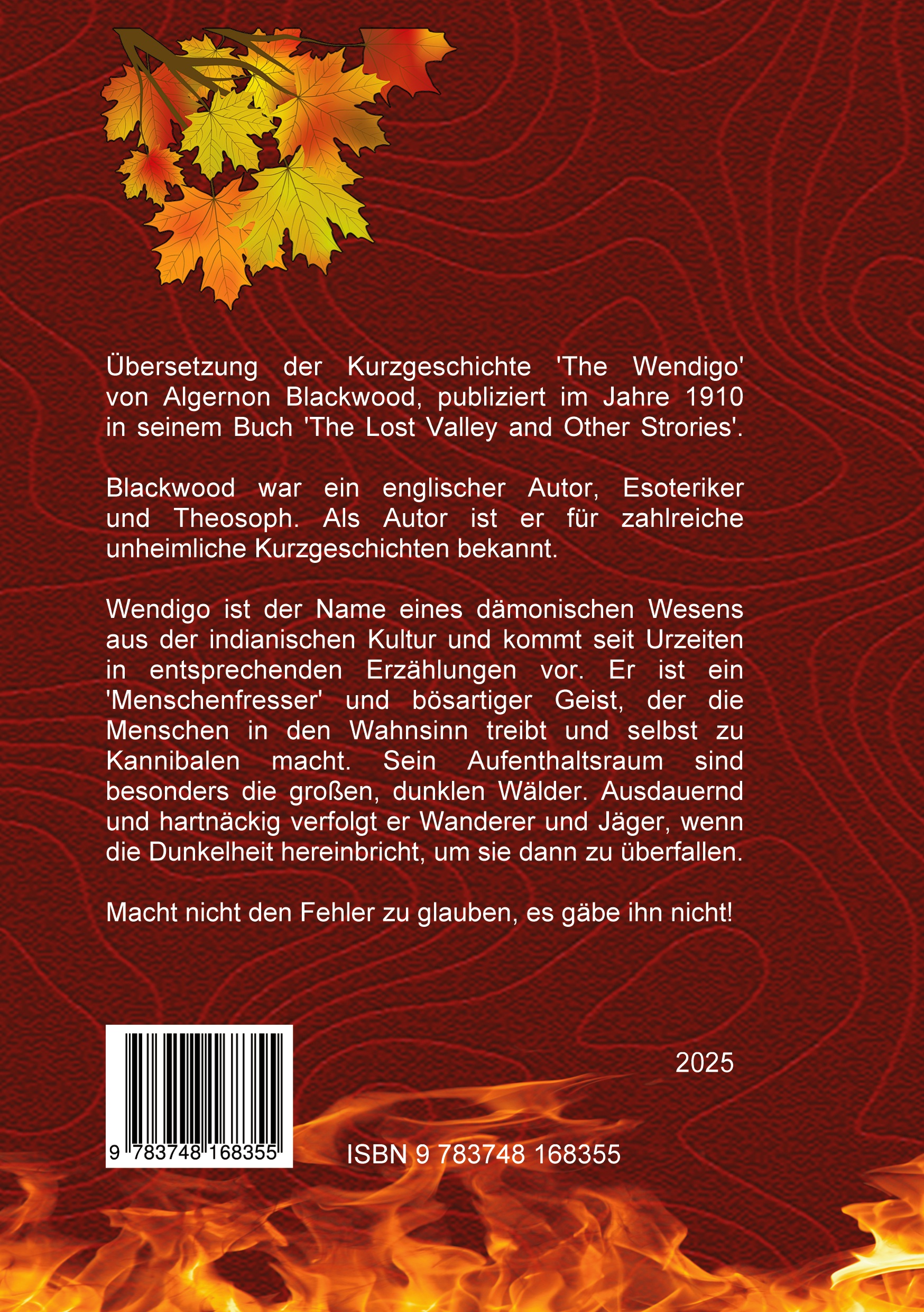 Uebersetzung der Kurzgeschichte 'The Wendigo' von Algernon Blackwood, publiziert im Jahre 1910 in seinem Buch 'The Lost Valley and Other Strories'.Blackwood war ein englischer Autor, Esoteriker und Theosoph. Als Autor ist er für zahlreiche unheimliche Kurzgeschichten bekannt.Wendigo ist der Name eines daemonischen Wesens aus der indianischen Kultur und kommt seit Urzeiten in entsprechenden Erzaehlungen vor. Er ist ein "Menschenfresser" und boesartiger Geist, der die Menschen in den Wahnsinn treibt und selbst zu Kannibalen macht. Sein Aufenthaltsraum sind besonders die großen, dunklen Waelder. Ausdauernd und hartnaeckig verfolgt er Wanderer und Jaeger, wenn die Dunkelheit hereinbricht, um sie dann zu ueberfallen.