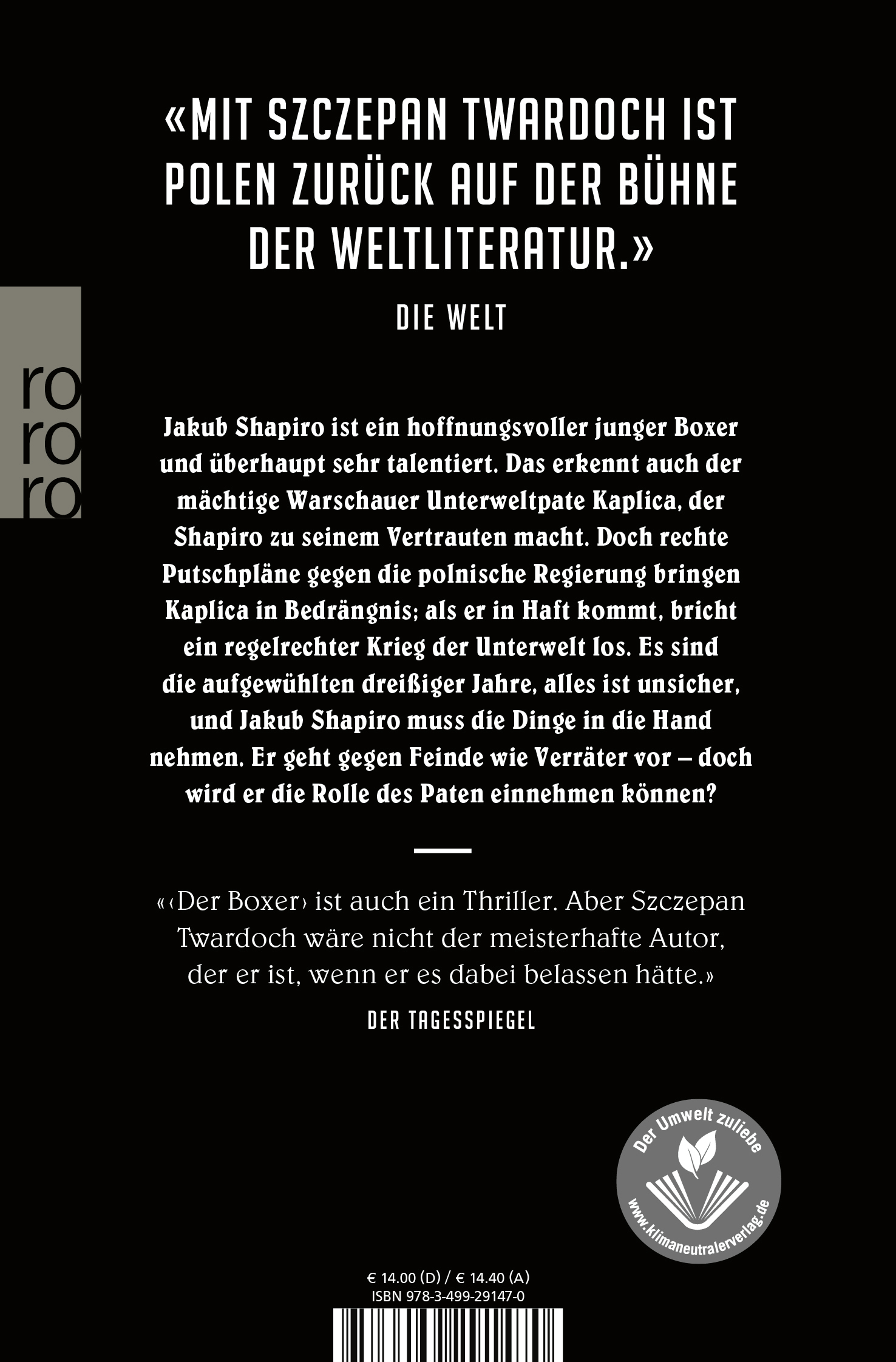 Der Aufstieg eines Verbrecherhelden zwischen Gewalt, Eleganz und Laster, seine Verletzlichkeit als Jude im Vorkriegs-Warschau: «Der Boxer» ist grandios angelegt und fast filmisch erzählt, ein Panorama mit Sportlern und Schurken, einem Mann mit zwei Gesichtern, glamourösen Huren und charismatischen Gangstern. Ein überragender, thrillerhafter Roman, der eine eruptive Epoche geradezu körperlich erlebbar macht.