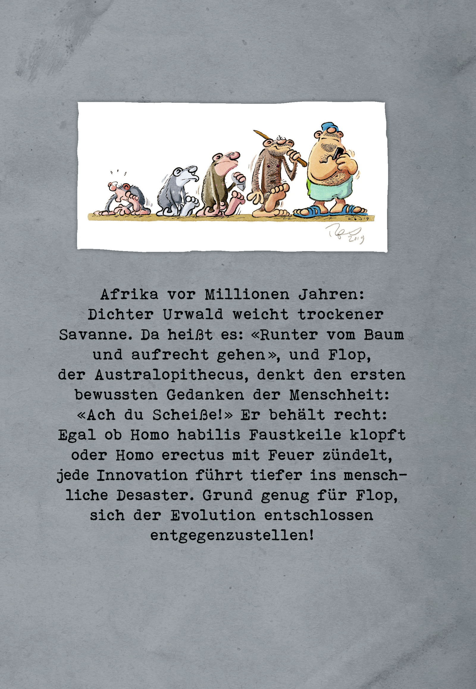 Er behält recht, denn egal, ob Homo Habilis Faustkeile kloppt oder Homo Erectus mit Feuer zündelt, jeder neue Handgriff führt tiefer ins Desaster! Und gerade als die Männchen anfangen, Gammelfleisch zu fressen, und sich als Herren der Welt fühlen, beschließen die Weibchen, ihren Eisprung zu verstecken, so dass beim Balzen keiner mehr weiß, woran er ist. Flop stört's nicht weiter, er steht ohnehin mehr auf den stämmigen Homo Robustus, der mit seiner Horde friedlich in der Steppe grast.
