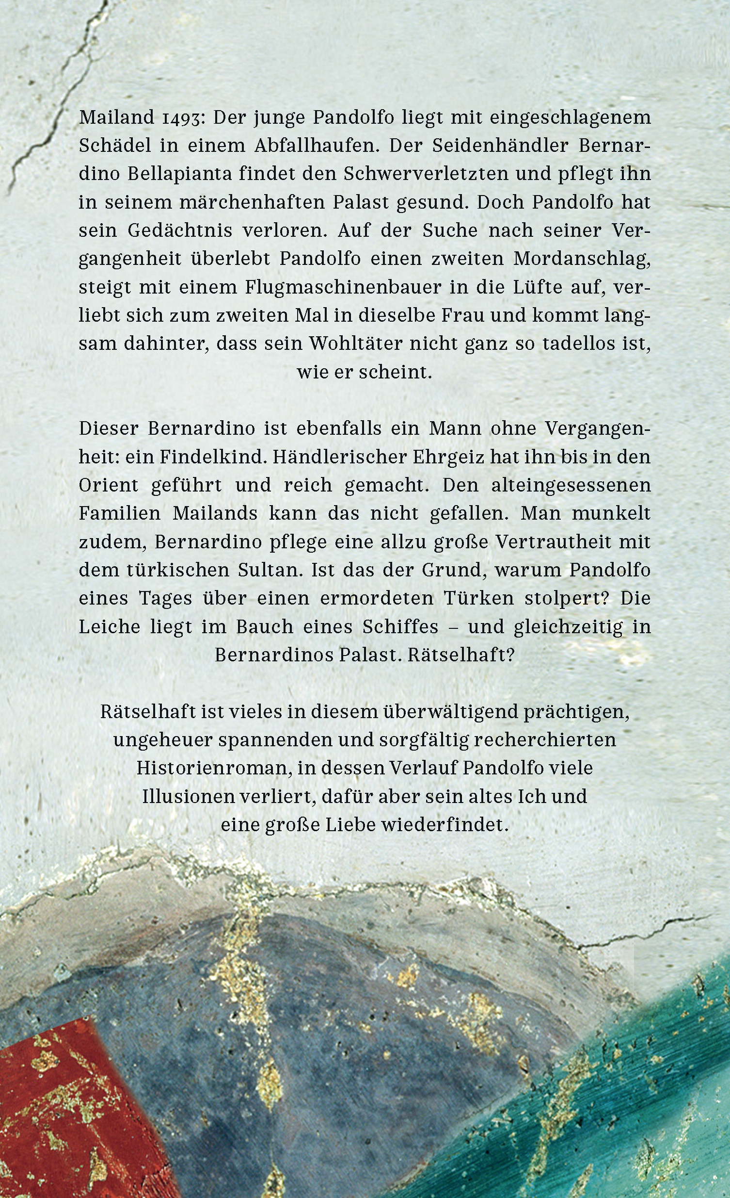 Mailand 1493: Der junge Pandolfo wird schwer verletzt und ohne Gedächtnis von dem Seidenhändler Bernadino Bellapianta auf der Straße gefunden. Nun arbeitet er für den reichen Unternehmer und Abenteurer. Auf der Suche nach seiner Vergangenheit steigt Pandolfo mit einem Flugmaschinenbauer in die Lüfte auf, stolpert über einen toten Osmanen, verliebt sich zum zweiten Mal in dieselbe Frau, überlebt einen weiteren Mordanschlag und kommt langsam dahinter, dass sein Wohltäter nicht ganz so tadellos ist, wie er scheint.