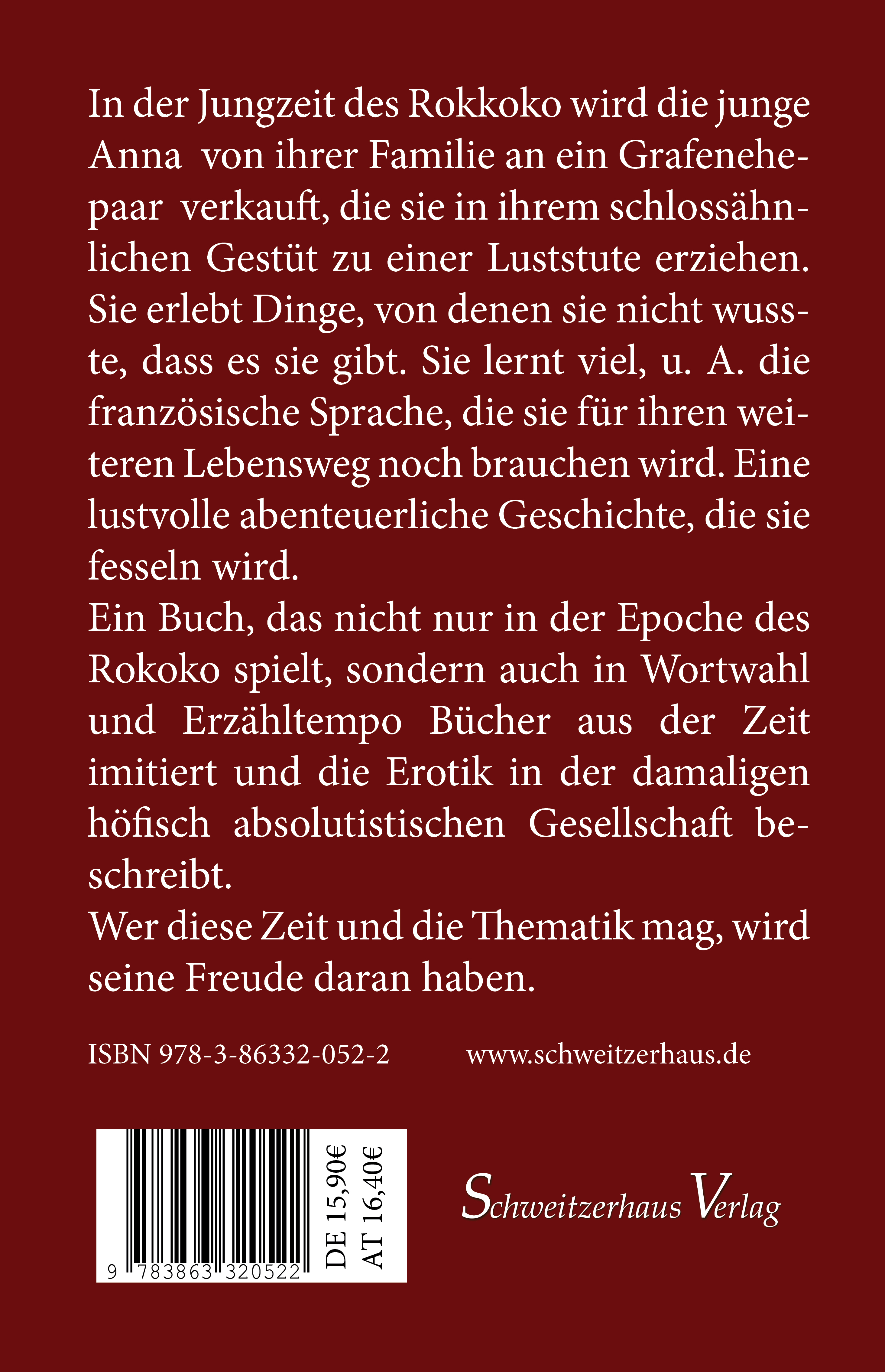 In der Jungzeit des Rokkoko wird die junge Anna von ihrer Familie an ein Grafenehepaar verkauft, die sie in ihrem schlossähnlichen Gestüt zu einer Luststute erziehen. Sie erlebt Dinge, von denen sie nicht wusste, dass es sie gibt. Sie lernt viel, u. A. die französische Sprache, die sie für ihren weiteren Lebensweg noch brauchen wird. Eine lustvolle abenteuerliche Geschichte, die sie fesseln wird. Ein Buch, das nicht nur in der Epoche des Rokoko spielt, sondern auch in Wortwahl und Erzähltempo Bücher aus der Zeit imitiert und die Erotik in der damaligen höfisch absolutistischen Gesellschaft beschreibt. Wer diese Zeit und die Thematik mag, wird seine Freude daran haben.