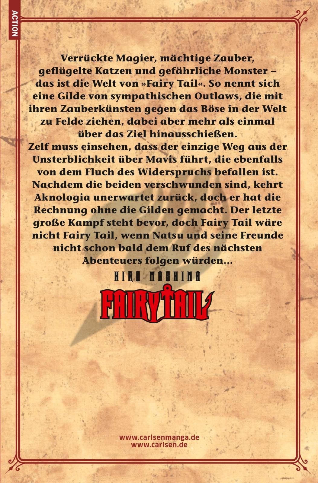 Zelf muss einsehen, dass der einzige Weg aus der Unsterblichkeit über Mavis führt, die ebenfalls von dem Fluch des Widerspruchs befallen ist. Nachdem die beiden verschwunden sind, kehrt Aknologia unerwartet zurück, doch er hat die Rechnung ohne die Gilden gemacht. Der letzte große Kampf steht bevor, doch Fairy Tail wäre nicht Fairy Tail, wenn Natsu und seine Freunde nicht schon bald dem Ruf des nächsten Abenteuers folgen würden...