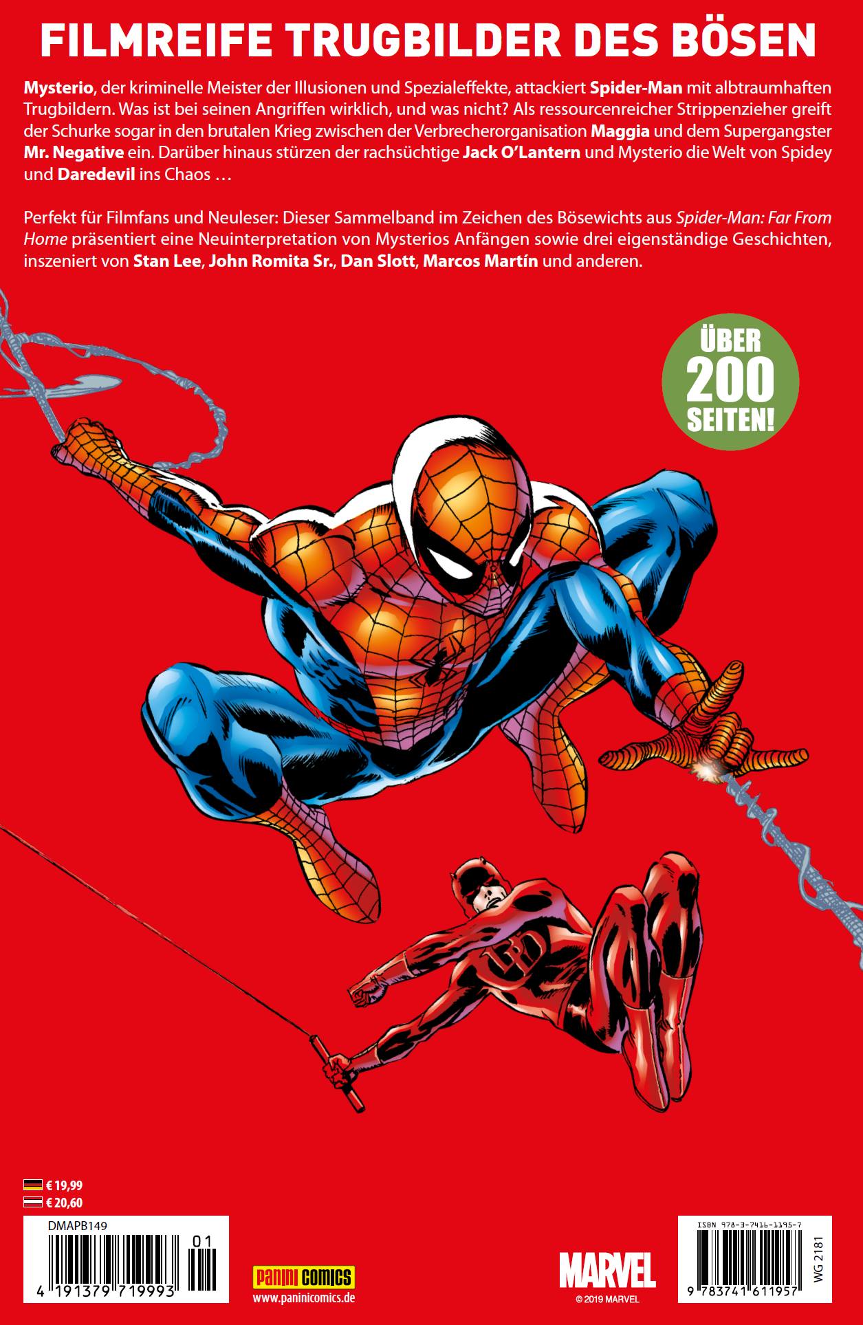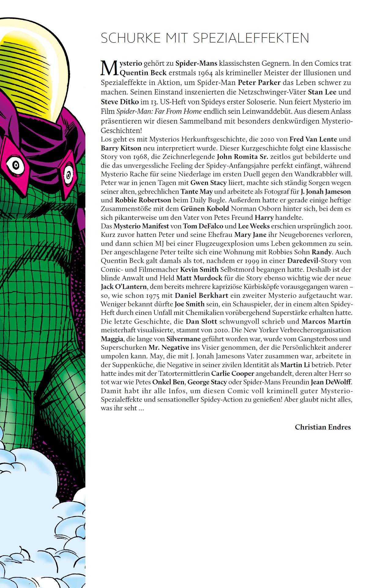 SCHURKE MIT SPEZIALEFFEKTEN von Christian EndresMysterio gehört zu Spider-Mans klassischsten Gegnern. In den Comics trat Quentin Beck erstmals 1964 als krimineller Meister der Illusionen und Spezialeffekte in Aktion, um Spider-Man Peter Parker das Leben schwer zu machen. Seinen Einstand inszenierten die Netzschwinger-Väter Stan Lee und Steve Ditko im 13. US-Heft von Spideys erster Soloserie. Nun feiert Mysterio im Film Spider-Man: Far From Home endlich sein Leinwanddebüt. Aus diesem Anlass präsentieren wir diesen Sammelband mit besonders denkwürdigen Mysterio-Geschichten!Los geht es mit Mysterios Herkunftsgeschichte, die 2010 von Fred Van Lente und Barry Kitson neu interpretiert wurde. Dieser Kurzgeschichte folgt eine klassische Story von 1968, die Zeichnerlegende John Romita Sr. zeitlos gut bebilderte und die das unvergessliche Feeling der Spidey-Anfangsjahre perfekt einfängt, während Mysterio Rache für seine Niederlage im ersten Duell gegen den Wandkrabbler will. Peter war in jenen Tagen mit Gwen Stacy liiert, machte sich ständig Sorgen wegen seiner alten, gebrechlichen Tante May und arbeitete als Fotograf für J. Jonah Jameson und Robbie Robertson beim Daily Bugle. Außerdem hatte er gerade einige heftige Zusammenstöße mit dem Grünen Kobold Norman Osborn hinter sich, bei dem es sich pikanterweise um den Vater von Petes Freund Harry handelte.Das Mysterio Manifest von Tom DeFalco und Lee Weeks erschien ursprünglich 2001. Kurz zuvor hatten Peter und seine Ehefrau Mary Jane ihr Neugeborenes verloren, und dann schien MJ bei einer Flugzeugexplosion ums Leben gekommen zu sein. Der angeschlagene Peter teilte sich eine Wohnung mit Robbies Sohn Randy. Auch Quentin Beck galt damals als tot, nachdem er 1999 in einer Daredevil-Story von Comic- und Filmemacher Kevin Smith Selbstmord begangen hatte. Deshalb ist der blinde Anwalt und Held Matt Murdock für die Story ebenso wichtig wie der neue Jack O'Lantern, dem bereits mehrere kapriziöse Kürbisköpfe vorausgegangen waren - so, wie schon 1975 mit Daniel Berkhart ein zweiter Mysterio aufgetaucht war. Weniger bekannt dürfte Joe Smith sein, ein Schauspieler, der in einem alten Spidey-Heft durch einen Unfall mit Chemikalien vorübergehend Superstärke erhalten hatte.Die letzte Geschichte, die Dan Slott schwungvoll schrieb und Marcos Martín meisterhaft visualisierte, stammt von 2010. Die New Yorker Verbrecherorganisation Maggia, die lange von Silvermane geführt worden war, wurde vom Gangsterboss und Superschurken Mr. Negative ins Visier genommen, der die Persönlichkeit anderer umpolen kann. May, die mit J. Jonah Jamesons Vater zusammen war, arbeitete in der Suppenküche, die Negative in seiner zivilen Identität als Martin Li betrieb. Peter hatte indes mit der Tatortermittlerin Carlie Cooper angebandelt, deren alter Herr so tot war wie Petes Onkel Ben, George Stacy oder Spider-Mans Freundin Jean DeWolff.Damit habt ihr alle Infos, um diesen Comic voll kriminell guter Mysterio-Spezialeffekte und sensationeller Spidey-Action zu genießen! Aber glaubt nicht alles, was ihr seht ...