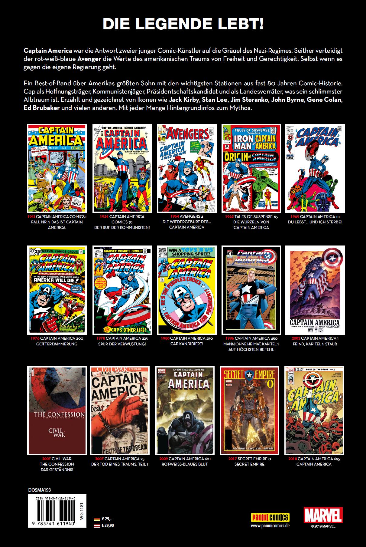 DER LETZTE AMERIKANER von Thomas Witzler Als Captain America erstmals ins Rampenlicht trat, stand die Welt am Abgrund. Europa brannte lichterloh. Angestachelt von Expansionsgelüsten und absurden Rassentheorien hatten deutsche Sturmtruppen den Kontinent im Stechschritt überrannt. Überall, wo blank polierte Wehrmachtsstiefel zum Alltagsbild gehörten, wurden Menschenrechte mit Füßen getreten und Minderheiten terrorisiert. Obwohl leicht zu erkennen war, wer in dem Konflikt die Bösen sind, hielten sich die Vereinigten Staaten raus aus dem Krieg in Übersee. Das entsprach mehrheitlich dem Willen der Bevölkerung. Viele US-Bürger hatten deutsche Vorfahren. Sie taten sich schwer bei dem Gedanken, gegen die Heimat ihrer Väter ins Feld zu ziehen. Andere sahen im Falle eines Kriegseintritts die Demokratie und Grenzen der USA gefährdet oder glaubten, es sei eine rein europäische Angelegenheit. Im September 1940 wurde das America First Committee von besorgten Bürgern ins Leben gerufen. Prominente wie der spätere Präsident Gerald Ford, Automagnat Henry Ford, Pilot Charles Lindbergh oder Filmproduzent Walt Disney unterstützten die isolationistische Bewegung, die eine Kriegsbeteiligung strikt ablehnte. Inmitten der aufgeheizten Debatte erschien ein Held am Kiosk, der Befürwortern einer Intervention wie ein Fanal der Hoffnung erschienen sein muss, wie ein Versprechen. Und er trug die Farben der amerikanischen Flagge auf dem gestählten Leib. Captain America sollte den Zauderern in Erinnerung rufen, auf welchen Tugenden und Werten die Nation einst aufgebaut wurde. Land of the Free, Home of the Brave. Und der Mann in Stars-and-Stripes symbolisierte das Beste davon. Freiheit und Gerechtigkeit. Für jedermann und überall. Bereits auf dem Cover der ersten Ausgabe verpasst Captain America dem “Führer” einen Schwinger. Auf dem zweiten Heft springt er Hitler an. Insgesamt bekämpft Cap auf den Titelbildern der ersten acht Ausgaben ausschließlich grausige Nazis. Andere kostümierte Comic-Recken taten es ihm gleich. Und tatsächlich: Die Stimmung kippte. Am 8. Dezember 1941, also ein paar Monate nach der Veröffentlichung von Captain America Comics 1, erklärten die USA Japan den Krieg. Nicht aufgrund der bunten Hefte, sondern wegen Pearl Harbor. Die deutsche Reaktion folgte auf den Fuß und Amerika erwiderte prompt. [...]