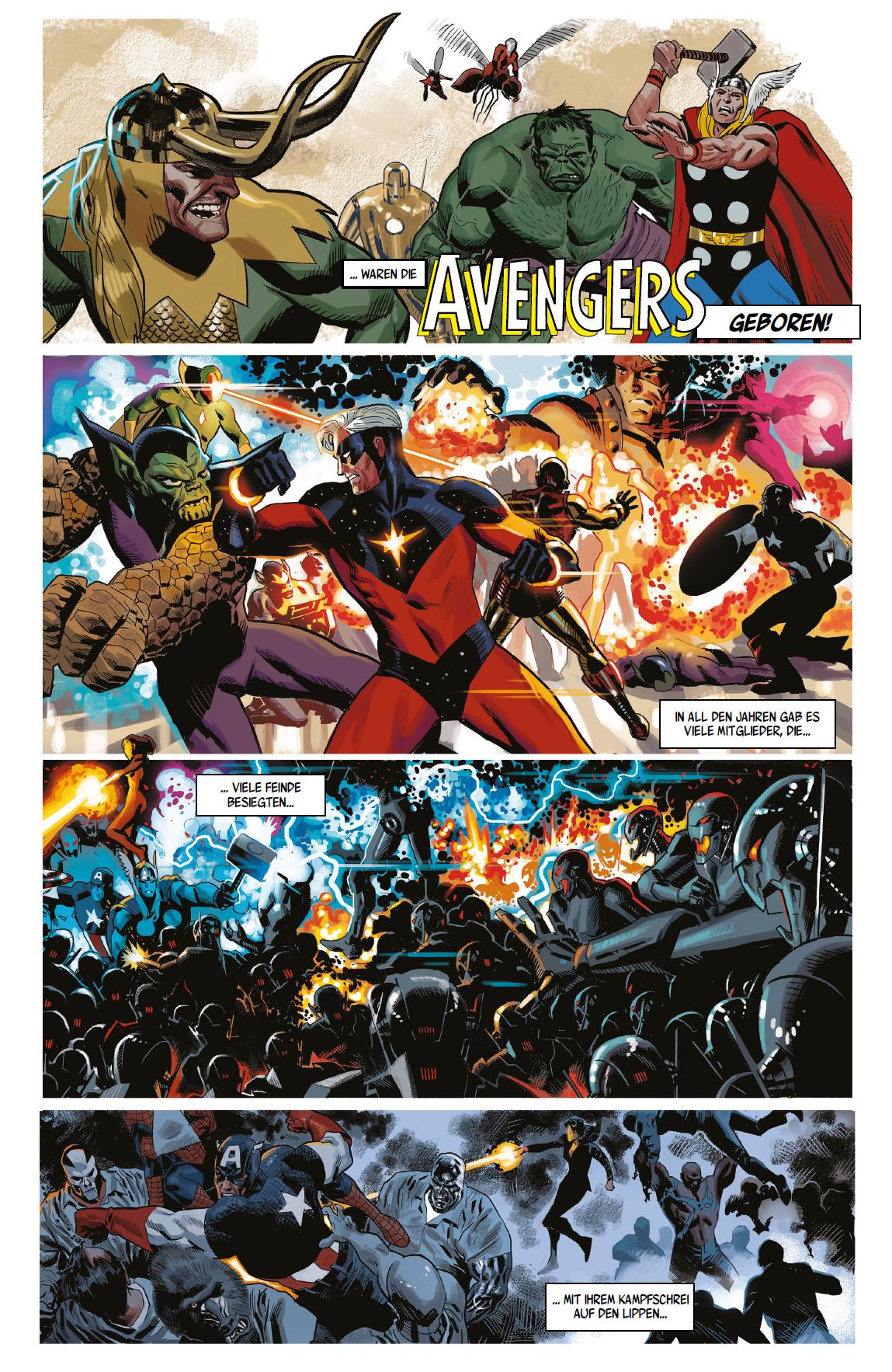 TRADITION UND INNOVATION von Christian Endres Das Marvel-Universum kann auf eine reichhaltige Historie zurückblicken. Gleichzeitig wandelte sich in den jüngsten Comic-Geschichten aus dem Haus der Ideen eine Menge – selbst die größten Ikonen sind nicht vor Veränderungen gefeit. Dieser Band markiert den Beginn der Legacy-Ära, in der es darum geht, Innovation und Tradition verschmelzen zu lassen. Gleichzeitig bieten Autor Jason Aaron und die Zeichner um Esad Ribić und Steve McNiven einen Ausblick auf künftige Storylines und Ereignisse. Etwa auf die kosmischen Spektakel Infinity Countdown und Infinity Wars über die Rückkehr der Infinity-Steine, die Zeit und Realität verändern können; den Neustart für das Avengers-Team; oder die Rückkehr der Fantastic Four, die seit Secret Wars aufgelöst sind, da nur das Ding und die Fackel auf der Erde zurückblieben, während Reed, Sue und ihre Kids die Welten des Marvel-Multiverse erkunden. Doch es hat sich noch weit mehr getan. Der frühere Falcon Sam Wilson ist als neuer Captain America unterwegs, während ausgerechnet Steve Rogers in Secret Empire das Hydra-Regime vorübergehend zur Macht führte; Deadpool beendete seine Heldenkarriere mit einem Mord; Iron Man Tony Stark liegt im Koma, weshalb das junge Genie Riri Williams als Ironheart in seine Fußstapfen trat; der Sohn des Odin ist unwürdig, seinen Hammer Mjolnir zu heben, woraufhin Jane Foster zu Thor wurde; Wolverine starb in einer Hülle aus Adamantium, und sein Klon Laura Kinney agiert als seine Nachfolgerin; und Robbie Reyes ist der neueste Ghost Rider. Doch Aaron und Co. setzen nicht nur all diese alten und neuen Helden in Szene oder führen einen neuen Starbrand als Beschützer der Erde ein. Sie enthüllen außerdem, dass Allvater Odin in der Frühzeit der Erde ein erstes Avengers-Team anführte. Darüber hinaus hat sich Autor Robbie Thompson mit zahlreichen Zeichnern daran gemacht, in dreiseitigen Kurzgeschichten das zusammenzufassen, was viele der Marvel-Ikonen definiert – in diesem Band präsentieren wir erstmals all diese Storys gesammelt auf Deutsch. Ob Langzeitleser, Neuleser oder Filmfan: Viel Vergnügen mit dem ersten Schritt in die Zukunft des Marvel-Universums!