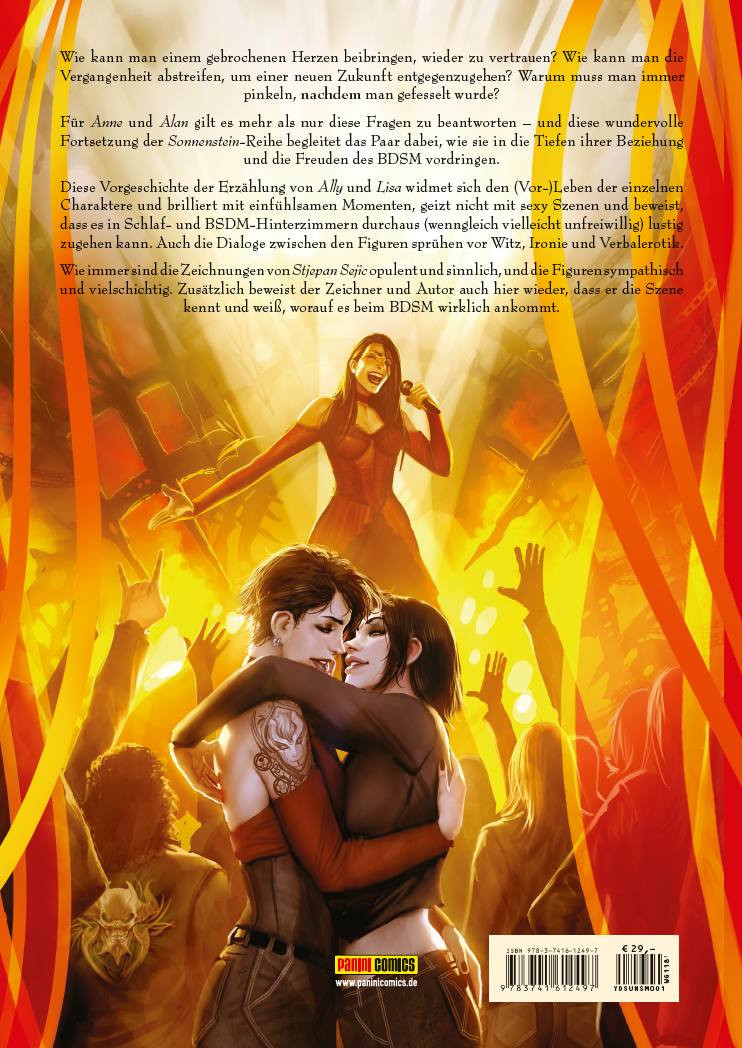 Wie kann man einem gebrochenen Herzen beibringen, wieder zu vertrauen? Wie kann man die Vergangenheit abstreifen, um einer neuen Zukunft entgegenzugehen? Warum muss man immer pinkeln, nachdem man gefesselt wurde? Für Anne und Alan gilt es mehr als nur diese Fragen zu beantworten - und diese wundervolle Fortsetzung der Sonnenstein-Reihe begleitet das Paar dabei, wie sie in die Tiefen ihrer Beziehung und die Freuden des BDSM vordringen.Diese Vorgeschichte der Erzählung von Ally und Lisa widmet sich den (Vor-)Leben der einzelnen Charaktere und brilliert mit einfühlsamen Momenten, geizt nicht mit sexy Szenen und beweist, dass es in Schlaf- und BSDM-Hinterzimmern durchaus (wenngleich vielleicht unfreiwillig) lustig zugehen kann. Auch die Dialoge zwischen den Figuren sprühen vor Witz, Ironie und Verbalerotik. Wie immer sind die Zeichnungen von Stjepan Sejic opulent und sinnlich, und die Figuren sympathisch und vielschichtig. Zusätzlich beweist der Zeichner und Autor auch hier wieder, dass er die Szene kennt und weiß, worauf es beim BDSM wirklich ankommt.