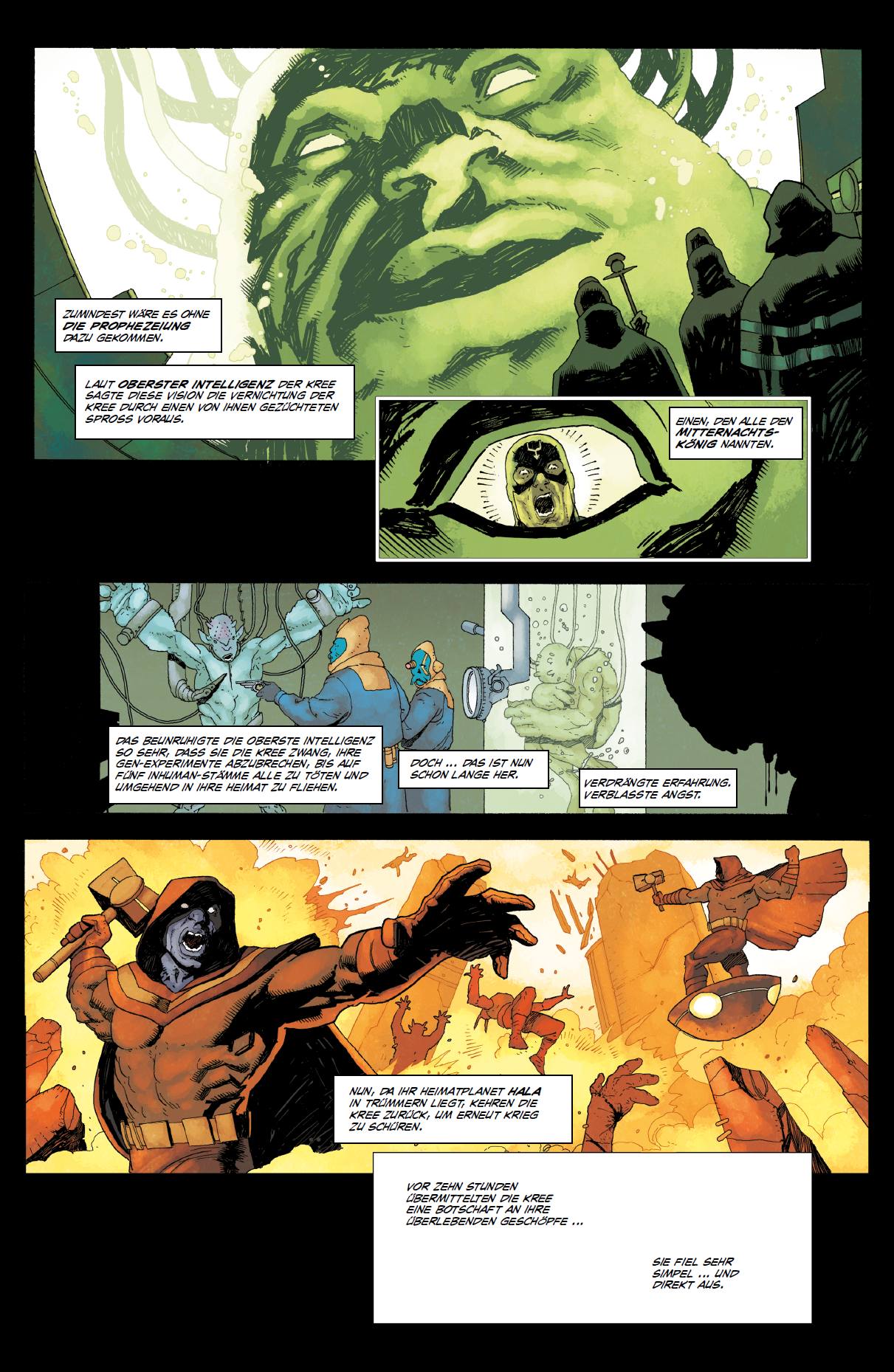 EINLEITUNG von Christian Endres Im Marvel-Universum gibt es viele außer-gewöhnliche Individuen und Gruppen. Die X-Men, den Titanen Thanos oder den Alien-Helden Beta Ray Bill, der einst würdig war, Thors Hammer zu heben und später seinen eigenen erhielt. Und die außerirdischen Kree, die nicht nur zur Legende von Captain Marvel gehören, sondern auch Teil der Mythologie der Inhumans sind. Die Inhumans wurden 1965 von Stan Lee und Jack Kirby in den Abenteuern der Fantastic Four ersonnen. Die hoch entwickelten, zwei Jahre später eingeführten Kree erschufen die Inhumans für ihren langwierigen Krieg gegen die Skrulls, wofür sie Gene der frühesten Erdenmenschen nutzten und veränderten. Durch das Ritual der Terrigenese und das Terrigen entfalten viele Inhumans ihr übermenschliches Potenzial, das sich in allen möglichen physischen oder psychischen Mutationen zeigen kann. Zu den berühmtesten Inhumans gehört König Black Bolt, dessen Stimme ganze Universen vernichten kann. Medusa weilte lange als Königin und Ehefrau an Black Bolts Seite, doch inzwischen sind sie nur noch Regierende und keine Liebenden mehr – sie ist sogar mit dem Krieger Gorgon liiert. Medusas Schwester Crystal gebietet über die Elemente, Black Bolts Bruder Maximus ist ein verrücktes und aggressives Genie, und der treue Inhuman-Hund Lockjaw kann teleportieren. Weil sein Bruder Triton seit der Terrigenese nur noch unter Wasser zu atmen vermag, durchlief Karnak nie das Ritual, dennoch wurde er zum Kampfmönch, der die Schwachpunkte in allen Dingen sieht. Black Bolts und Medusas Inhumans-Clan hat sich vor Kurzem wieder auf dem Mond niedergelassen, wo sie derzeit in New Arctilan residieren. Sie durchlebten zuletzt ebenso viele Veränderungen wie die Kree, deren Heimatplanet Hala vernichtet wurde – vorbei sind die Zeiten, da die Oberste Intelligenz und Ronan der Ankläger die Geschicke der Kree lenkten. In diesem coolen Band schlagen Autor Donny Cates und Zeichner Ariel Olivetti nun ein neues, brutales Kapitel in der Geschichte der Inhumans und der Kree auf …