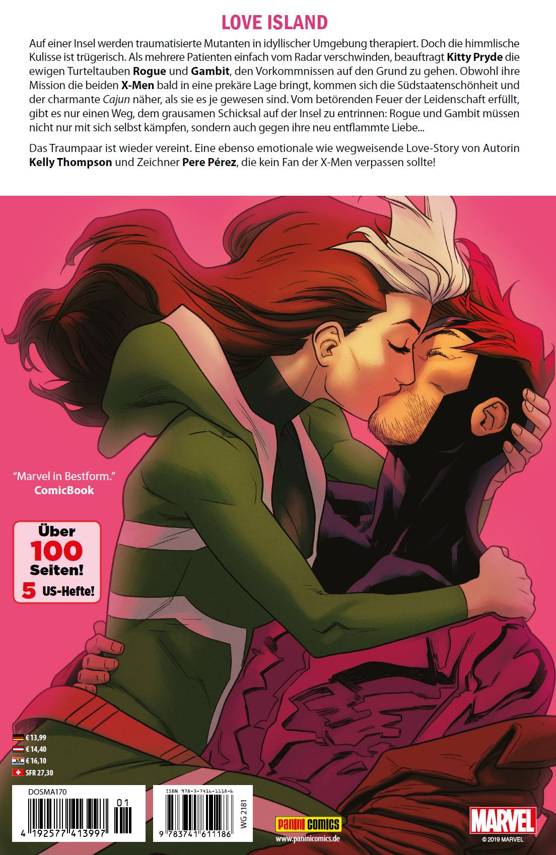 MUTANTEN IM BLICKPUNKT...von Thomas WitzlerDie X-Men Anna Marie alias Rogue und Remy LeBeau, auch bekannt als Gambit, verbinden viele Gemeinsamkeiten. Beide sind in der Pubertät ohne Eltern aufgewachsen. Und so gab es niemanden, der ihnen zur Seite stand, als sich ihre Mutantenkräfte erstmals manifestierten. Von Schurken manipuliert, gerieten die nach Nähe und Anerkennung dürstenden Außenseiter bald auf die schiefe Bahn. Rogue brachte Carol Danvers alias Ms./Captain Marvel unabsichtlich fast um und bekämpfte anschließend die Avengers, bevor sie von den X-Men aufgenommen wurde. Nur langsam schenkte das X-Team der ehemaligen Superschurkin das Vertrauen.Gambit tauchte einige Jahre später auf. Storm hatte seinerzeit ihre Erinnerung verloren und ging mit LeBeau in New Orleans auf Diebestour. Nachdem Ororo ihr Gedächtnis wiedererlangt hatte, überzeugte sie Gambit, die X-Men aufzusuchen. Dort lernte der charmante Schwerenöter Rogue kennen und lieben. Aber was sind sie heute? Freunde, Lover oder einfach nur Teamgefährten?