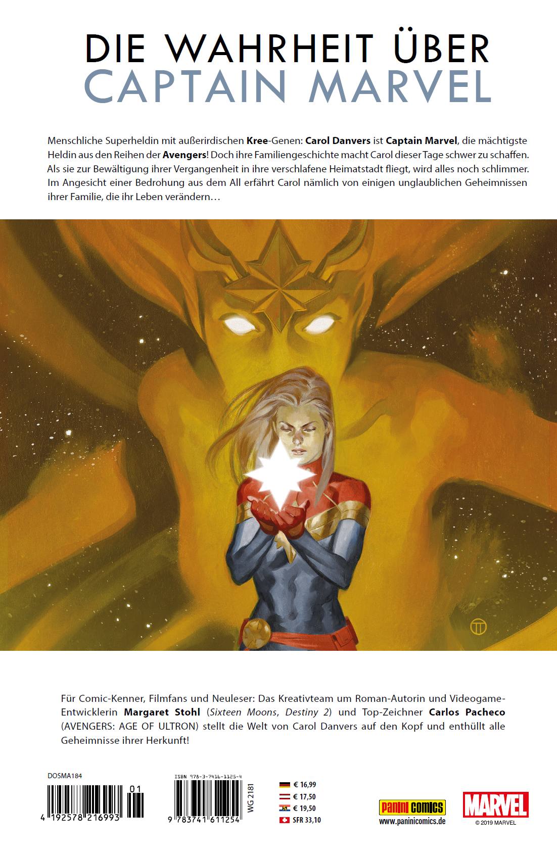 DIE MACHER MARGARET STOHL schrieb für Marvel schon mehrere Geschichten über Captain Marvel. Außerdem ist die 1967 geborene Amerikanerin eine erfolgreiche Roman-Autorin in den Bereichen Fantasy und Science-Fiction. Hier ist vor allem ihre Buchserie Sixteen Moons zu nennen, die in fast 40 Ländern und 30 Sprachen veröffentlicht wird und die es bis auf die Bestsellerliste der New York Times schaffte – 2013 wurde die Serie zudem verfilmt. Abseits von Comics und Büchern arbeitet Stohl seit vielen Jahren in der Videogame-Branche. Hier wirkte sie Ende der 90er als Autorin und Chefdesignerin an Klassikern wie Zork und Zork: Der Großinquisitor mit, später half sie bei der Entwicklung von Dune 2000, Command & Conquer: Red Alert und Command & Conquer: Tiberian Sun und Spider-Man. Zuletzt kümmerte sie sich um die Storys der gefeierten Science-Fiction-Game-Blockbuster der Destiny-Reihe. CARLOS PACHECO publizierte zunächst in seiner spanischen Heimat, in Italien und in England, bevor er Mitte der 90er seinen Einstand bei den großen amerikanischen Verlagen gab. Für Marvel und DC verwirklichte er die Marvel-Maxiserie AVENGERS: FOREVER, Busieks lange SUPERMAN-Saga und den unabhängigen Fantasy-Comic Arrowsmith, der sogar einmal in The Big Bang Theory erwähnt wurde. Dazu kommen DIE FANTASTISCHEN VIER, ULTIMATE THOR, diverse X-MEN-Comics in verschiedenen Epochen der Mutanten sowie mehrere Kapitel des Event-Krachers AVENGERS: AGE OF ULTRON. MARGUERITE SAUVAGE wendet ihre Kreativität als Zeichnerin, Illustratorin, Designerin und Autorin beruflich auf Zeichentrickserien und Videogames an, wobei ihr Comic-Schaffen Storys mit Thor, Angela, Scarlet Witch und der neuen Heldin Faith umfasst – und Sauvage schon diverse Preisnominierungen einbrachte. Zurzeit kümmert sie sich mit Autor Nick Spencer um die Comic-Abenteuer von Archie, Sabrina und Co. in Riverdale. ERICA D’URSO lebt in Mailand und führt ihre Zeichenkunst mit diesem Band erstmals einem breiteren Publikum vor. Zudem arbeitet sie an der eigenständigen Graphic Novel Prison Witch von Amy und Pat Shand, die via Kickstarter finanziert wurde.