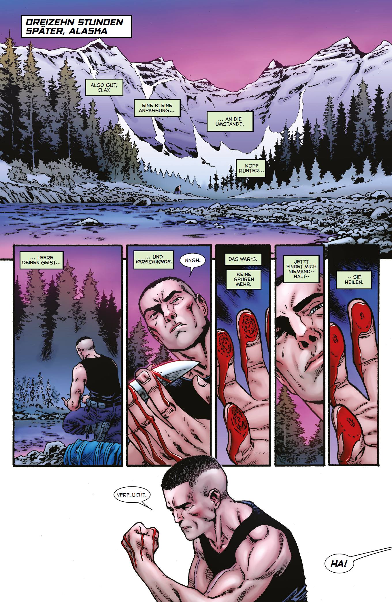 KÖNIG DER MONSTER von Thomas Witzler Nur wenig ist bislang über die Vergangenheit des ehemaligen Marine-Soldaten namens Clay bekannt. Als er vor einigen Wochen im Auftrag seines neuen Arbeitgebers Eaglestar das Leben mehrerer Dorfbewohner auslöschen sollte, verweigerte Clay den Befehl und tötete stattdessen sein eigenes Team. Zur Strafe lieferte ihn der skrupellose Rüstungskonzern an das berüchtigte Waffe X-Projekt aus, das einst die Knochen von Wolverine mit dem unzerstörbaren Metall Adamantium überzogen hatte. Eine brutale Prozedur, die auch Clay erdulden musste. Zudem stattete ihn der Wissenschaftler Dr. Alba dank entsprechender DNAProben mit den Kräften von Hulk und Wolverine aus. Nun befindet sich Waffe H, wie Clay inzwischen genannt wird, auf der Flucht vor seinen Peinigern. Um seine Frau und Kinder zu schützen, hat er beschlossen, völlig von der Bildfläche zu verschwinden. Leichter gesagt als getan. Mittlerweile ist die halbe Welt hinter ihm her…