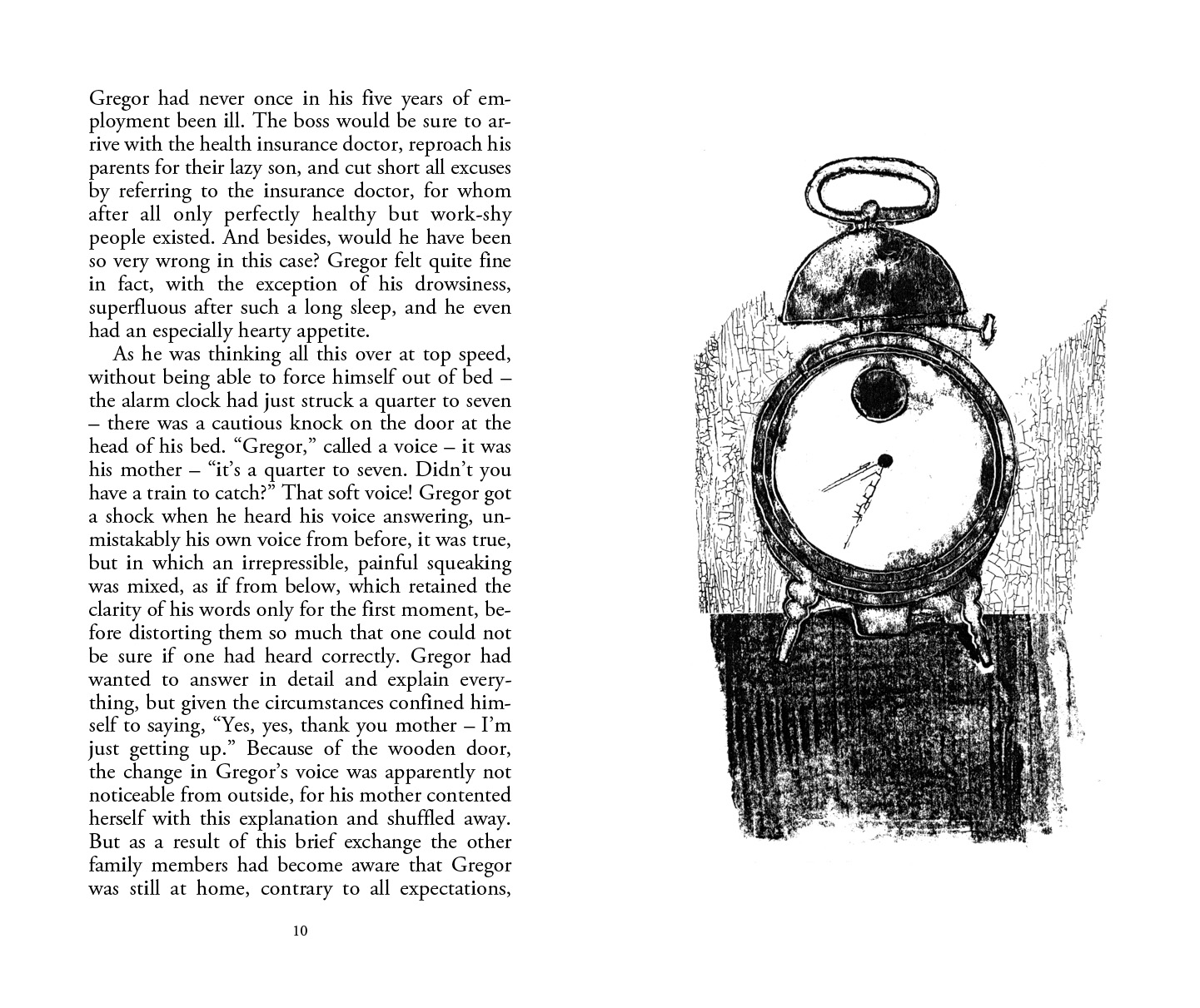 "Als Gregor Samsa eines Morgens aus unruhigen Träumen erwachte, fand er sich in seinem Bett zu einem ungeheueren Ungeziefer verwandelt. Er lag auf seinem panzerartig harten Rücken und sah, wenn er den Kopf ein wenig hob, seinen gewölbten, braunen, von bogenförmigen Versteifungen geteilten Bauch, auf dessen Höhe sich die Bettdecke, zum gänzlichen Niedergleiten bereit, kaum noch erhalten konnte. Seine vielen, im Vergleich zu seinem sonstigen Umfang kläglich dünnen Beine flimmerten ihm hilflos vor den Augen."