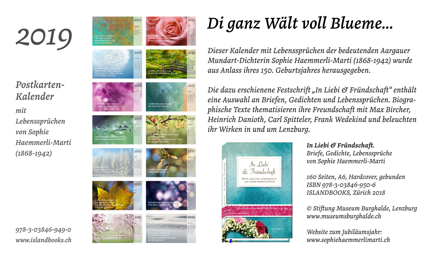 Anlässlich des Jubiläumsjahres „150 Johr Sophie Haemmerli-Marti“ hat die Stiftung Museum Burghalde eine Festschrift "In Liebi & Fründschaft" und einen Postkarten-Kalender 2019 herausgegeben.