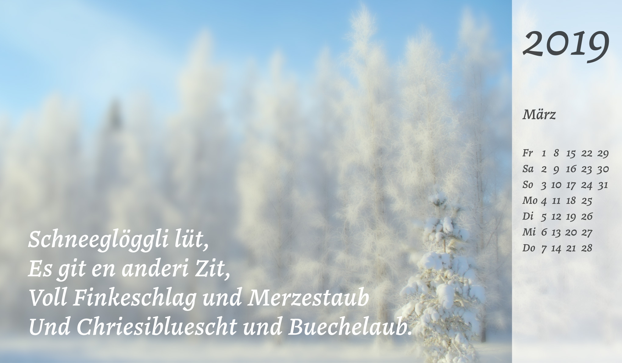 Der Postkarten-Kalender 2019 besteht aus 14 Postkarten zum Abtrennen im Format A6. Die Karten zeigen Motive aus der Natur mit Lebenssprüchen von Sophie Haemmerli-Marti . Geliefert werden die 14 Karten in einer Schachtel, die als Steller dient.