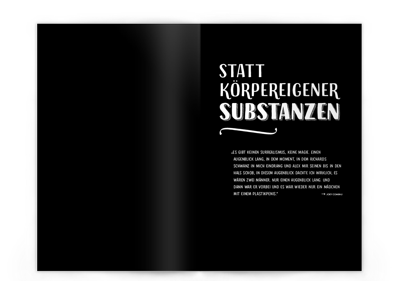 In diese Welt toxischer Männlichkeit geht Graeff hinein, ohne den Bankrott des Individuums zu erklären: Mechan- / Ismen Lieder Utopien. In drei Kapiteln durchspielt er Optionen von Rhythmus, Körper und Haltung. Das Gemachtsein durch die Welt verbindet Graeff mit Kulinarik - Sozialisation als aufwändiger Küchenakt. Im Sicheinverleiben wie in der Begegnung mit dem Fremden, etwa mit Tieren, kommen wir zu einem Ursprung, der nie einer war: der Ursprung aller Fehler am / Norm- / system zerbrochen.